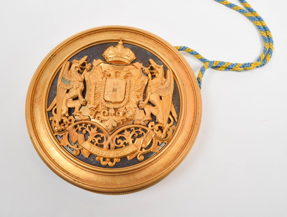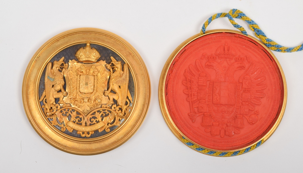 Vellum, folded, ca. 50 x 65 cm. and complete with the Imperial seal in wax (red) in accompanying metal box with on top the Imperial Arms in overlaid goldcoloured metal (diam. 12 cm.) with green-yellow cord attached to vellum. Kept in the original cased black cloth box with inscription: Öesterr. Kaiserl. Eiserne-Kron-Ordens-Diplom II. Classe. Minimal traces of use, in very good condition.