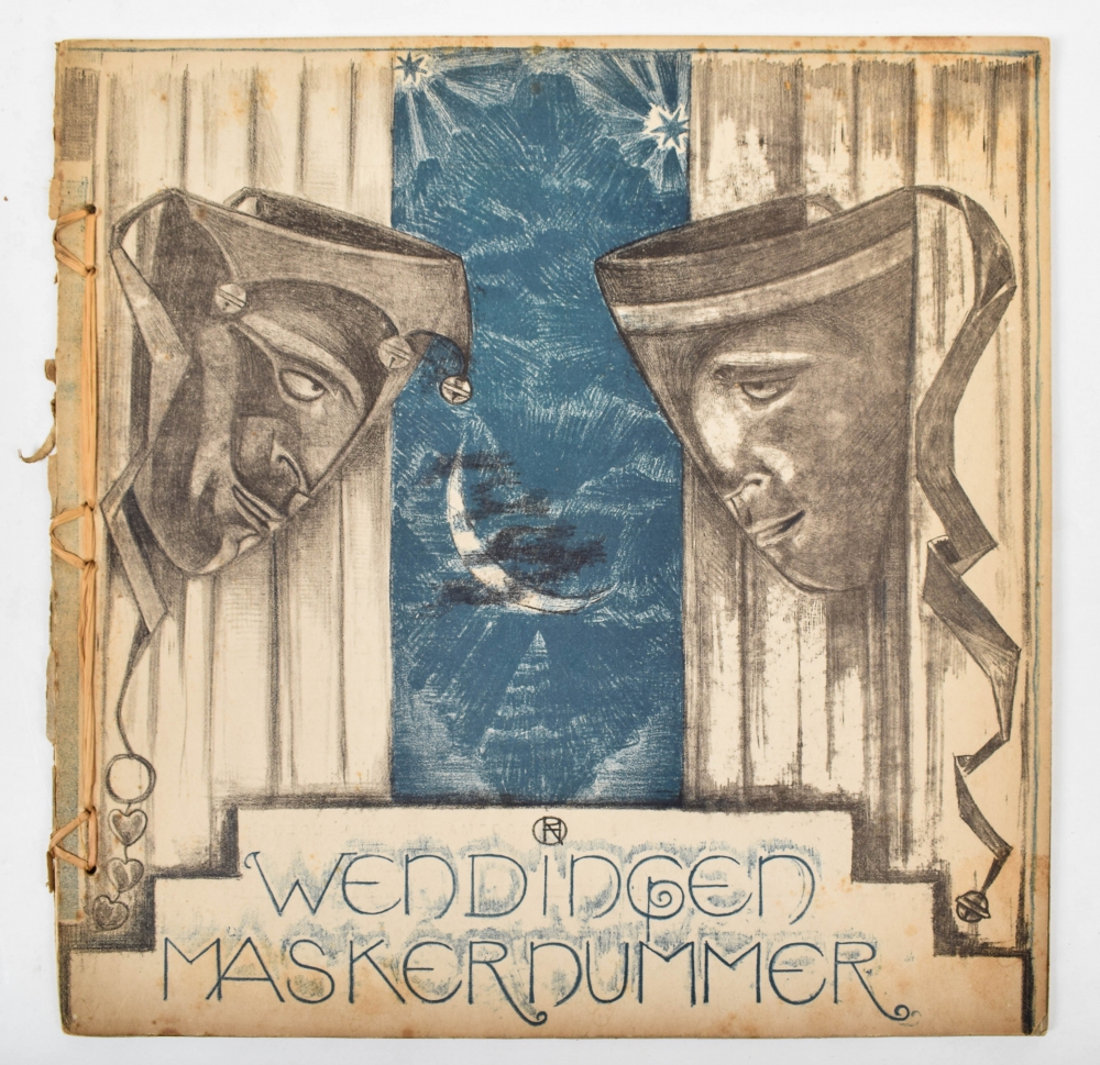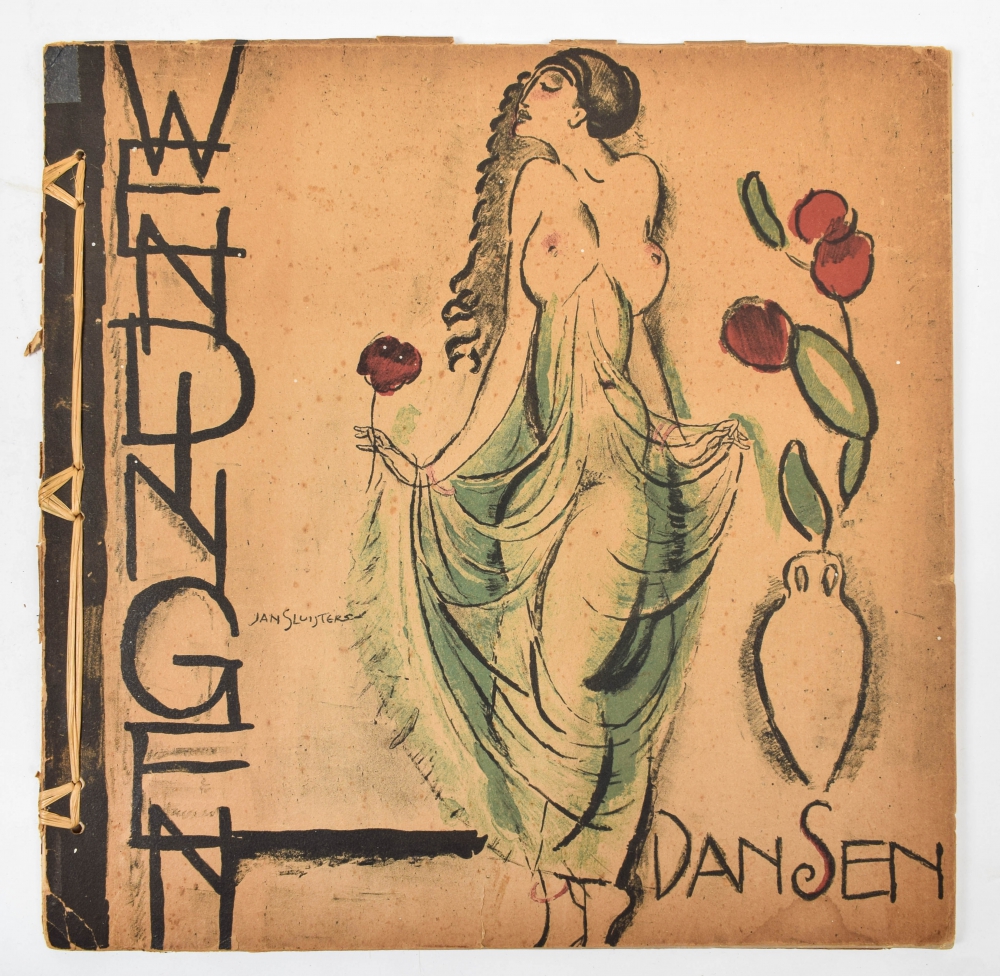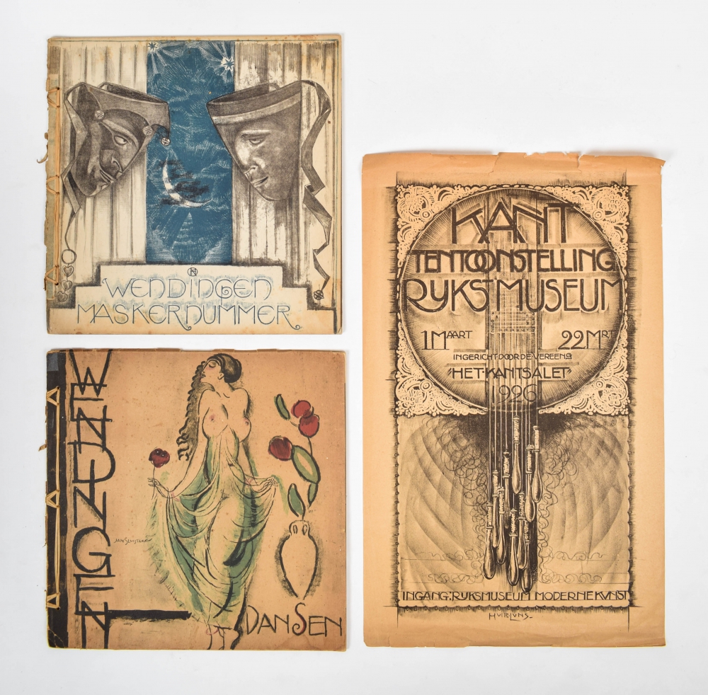 Second year no. 3, 1919. Gewijd aan de danskunst. Cover design Jan Sluijters. Light traces of use + third year no. 6/7, 1920. Maskernummer. Good copy. Both raffiabound - and Affiche Kant. Tentoonstelling Rijks Museum 1 maart - 22 maart. Ingericht door de vereniging Het Kantsalet 1926. Design Huib Luns. 54 x 32.5 cm. Frayed along top, without loss to paper.