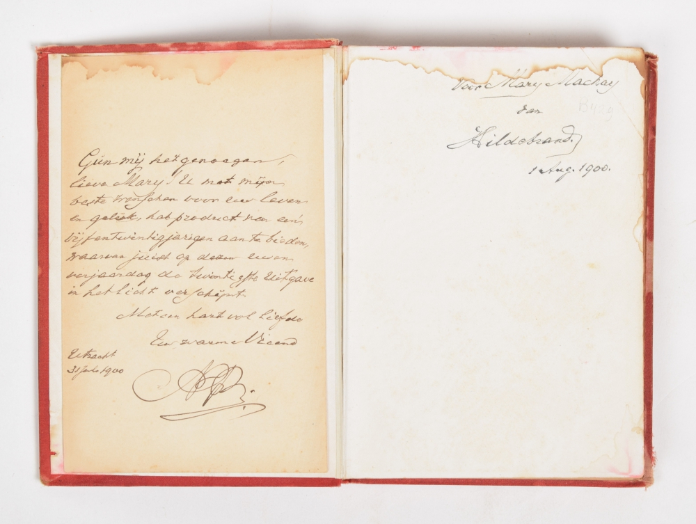 dated "Utrecht, 31 Juli 1900", addressed to "Lieve Mary" [Mackay] [= Marie Corelli], bifolium with only the first page written, elegantly monogrammed "NB", 18 x 11.5 cm. (waterstained in top edge), pasted in a very poor copy of the 20th edition of the Camera Obscura (1900) in original cloth (heavily waterstained on inside and outside), with on the free endpaper the dedication "Voor Mary Mackay van Hildebrand, 1 Aug. 1900".