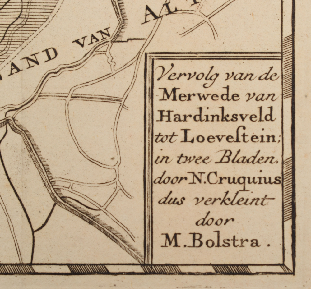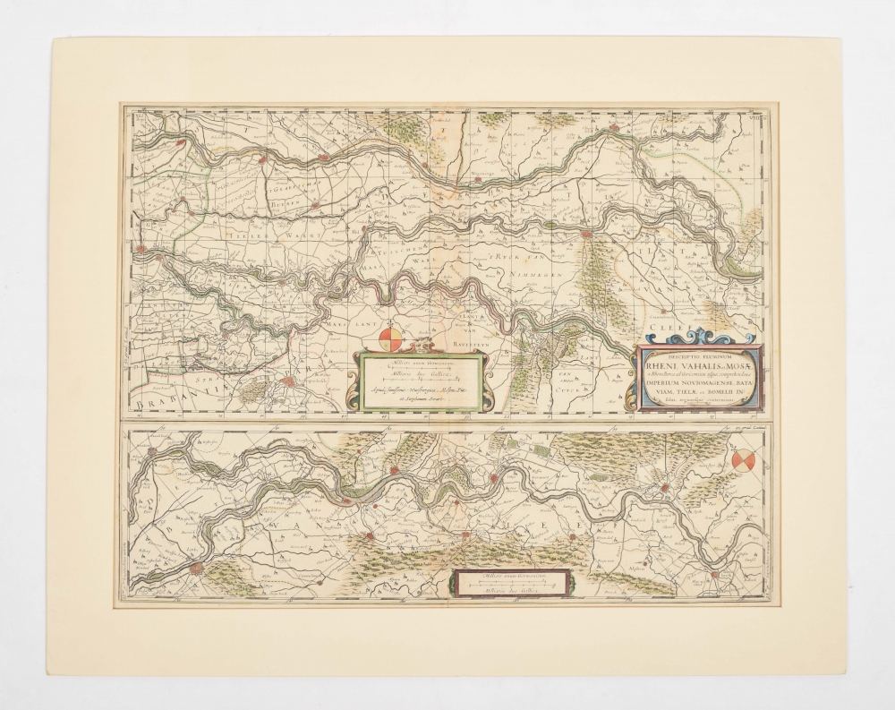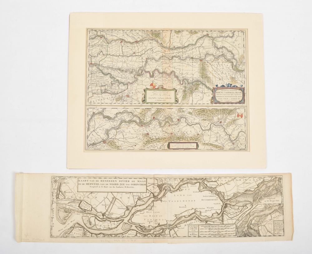 Rheni, Vahalis et Mosae a Rheno Berca ad Goricomium usque, comprehendens Imperium Noviomagense, Bataviam, Tielae et Bommelii insulas, regionesque conterminas. Janssonius van Waesberghe, Moses Pitt, Stephan Swart. London. 1680. 2 maps on one leaf in mount under plastic; map image 38 x 50 cm.; antiquely coloured, light discolouring. The river area from Rheinberg to Gorkum. Added: Kaart van de Beneeden Rivier de Maas en de Merwede, van de Noordzee tot Gorinchem. N. Cruquius & M. Bolstra. Ca. 1750 on a double leaf; map image 18 x 70 cm.