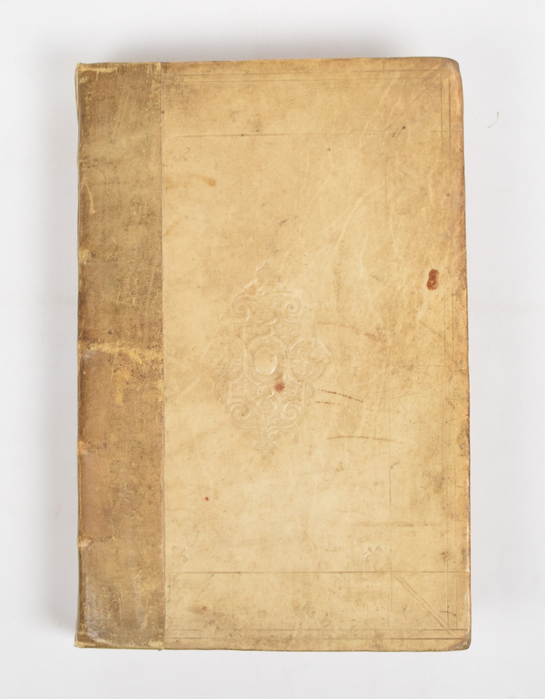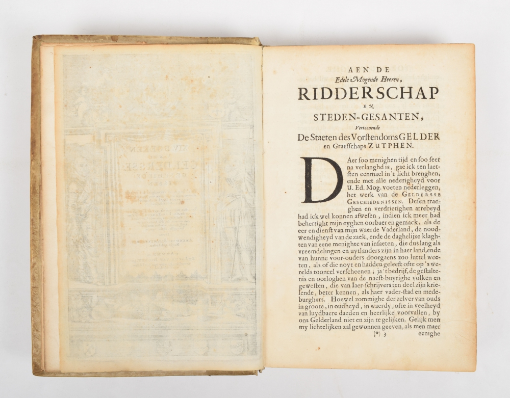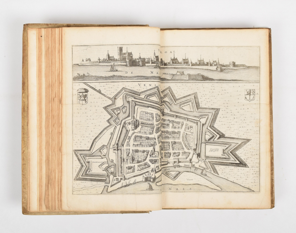 Small folio, vellum binding with blind stamp, illustrated frontispiece with e.g. title and Gelderland city arms. (12),116,(4),596,(24) pp., spine antiquely reinforced with vellum, ex libris, date stamp, lacks half title. Various woodcuts in the text; else complete with 20 copperplates of cities, fortifications and double-page regional maps + the large folding map of Hertogdom Gelre and Graafschap Zutphen by Willem Blaeu, with brown stains and reinforced along bottom with paper. Endpapers renewed. Somewhat shaken in binding, else good and complete copy.
