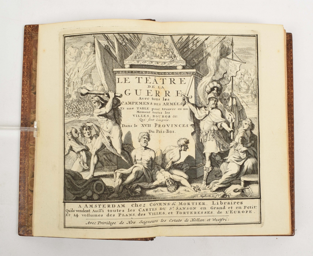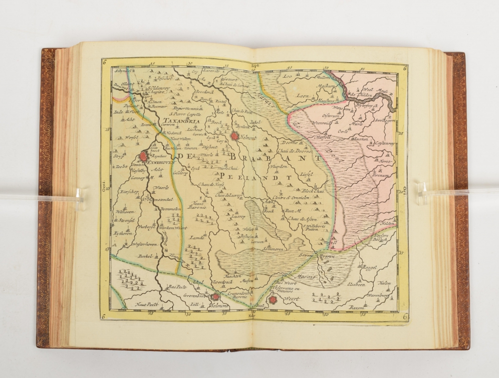 Door de gezamentlyke Nederlanden. Nevens een geographische beschryvinge en een lyst om de steden gemakkelyk te vinden [lyst = index in French at the end]/ Atlas portatif et nouveau du voyageur. Pour les dix-sept provinces des Pais-Bas (...). Amsterdam, Covens & Mortier, 1739, titles and descriptive text in Dutch and French, 24; (2),23,(1); 40,(8) p., (last 48 p. index only in French), with the following double-page engravings: frontispiece by K. Huyberts ("Le Théatre de la Guerre (...)", with address Covens & Mortier), handcoloured map of the Netherlands (A), overview map with the placement of the submaps (B), 4 handcoloured maps lettered C-F and 29 handcoloured maps numbered 1-29, also another two full-page engravings with scales (entirely as per the binder's indices in the Dutch and the French part, later binding in old style, in slipcase.