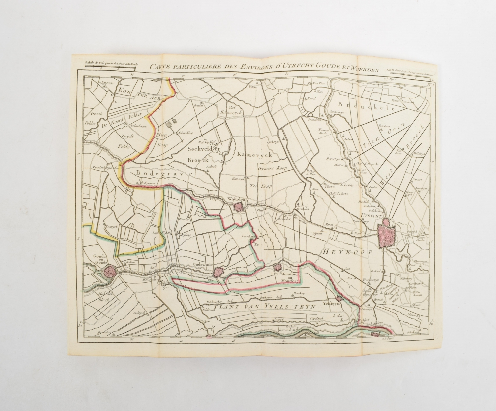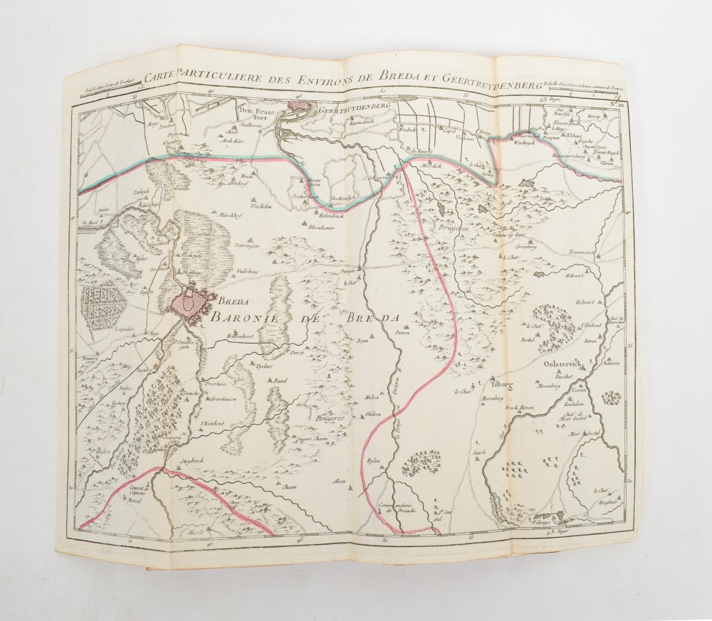 cartes tres detaillées du duché de Brabant et partie de la Hollande (...) Elle consistent en 25 petites cartes dont une générale divisée en 24 quarreaux (...). Lille etc., Bachelet etc., n.d. (1747 or 1750), double-page and folding overview map with engraved title on one leaf, followed by 24 double-page and folding submaps with coloured outlines, contemporary speckled sheepskin, gilt and ribbed back with morocco letterpiece, thin large 8vo.
