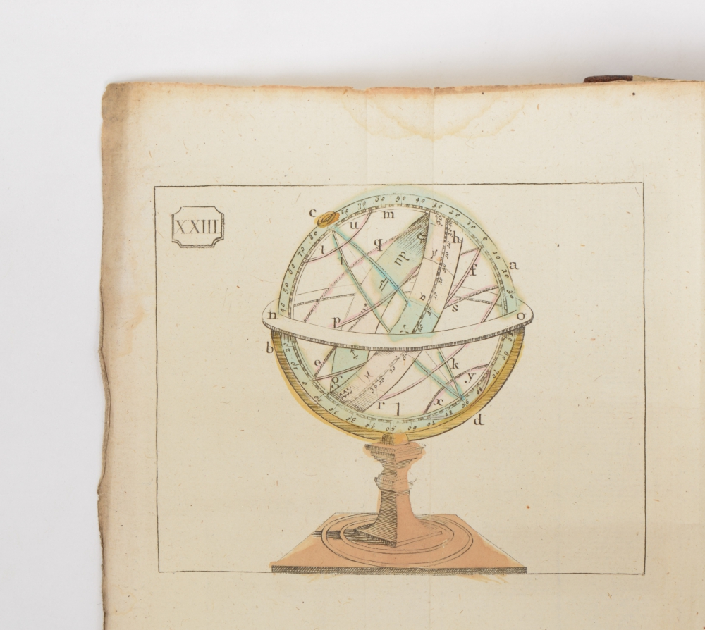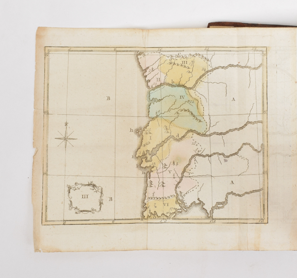 ou Principes clairs pour aprendre facilement en peu de tems la géographie; suivi d'un traité méthodique de la sphere (...) enrichie de XXIV cartes enluminées. Huitième édition, considérablement corrigée. Amsterdam & Leiden, J. van Gulik and A. & J. Honkoop, 1799, (4),II,53 [=253],(3) p., with handcoloured, engraved frontispiece, 22 folding, handcoloured engraved maps and another 2 folding, handcoloured plates, contemporary marbled calf, gilt ribbed back with morocco letterpiece.