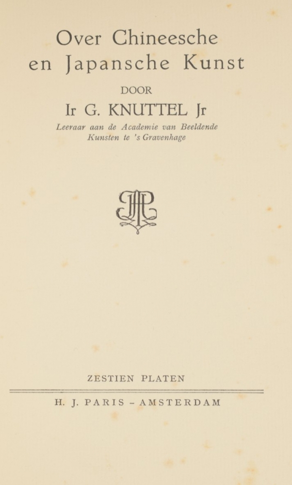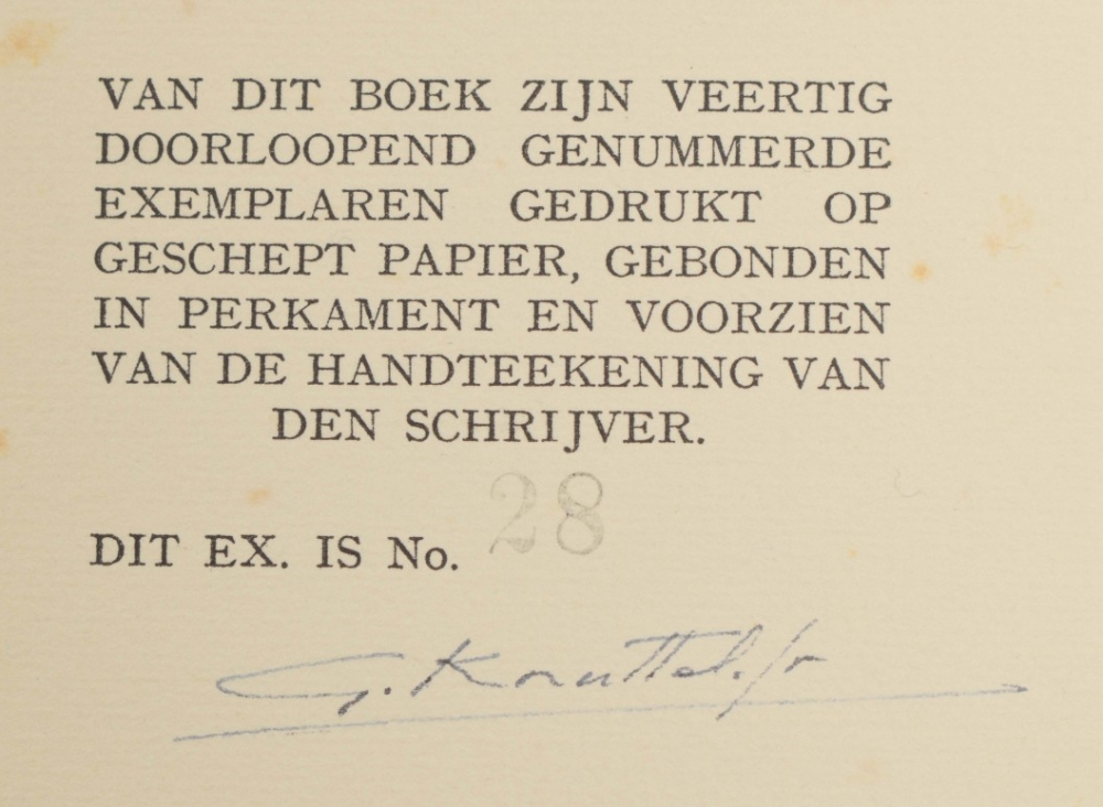 Ir G. Knuttel Jr. Amsterdam, H.J. Paris, 1936. Small 8vo, orig. publ. full vellum, gilt-lettered and decorated front boards and spine, gilt top edge. 139 pp. Ills. on 16 plates, bibliography. Deluxe copy, contents printed on special paper with wide margins, untrimmed. No. 28 of 40 copies signed by the author.