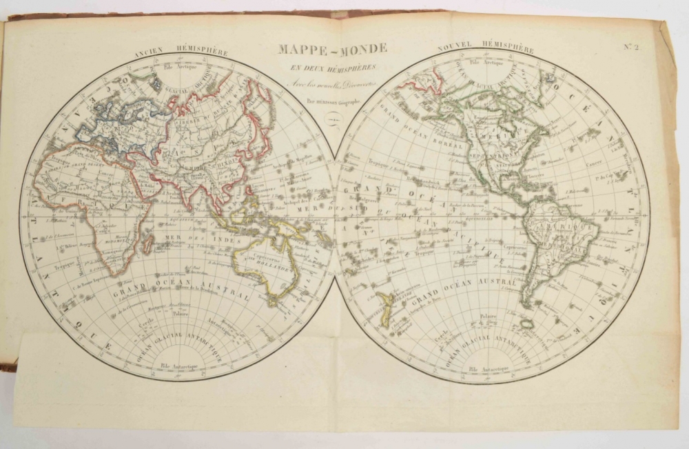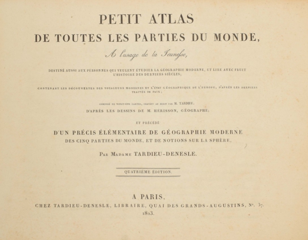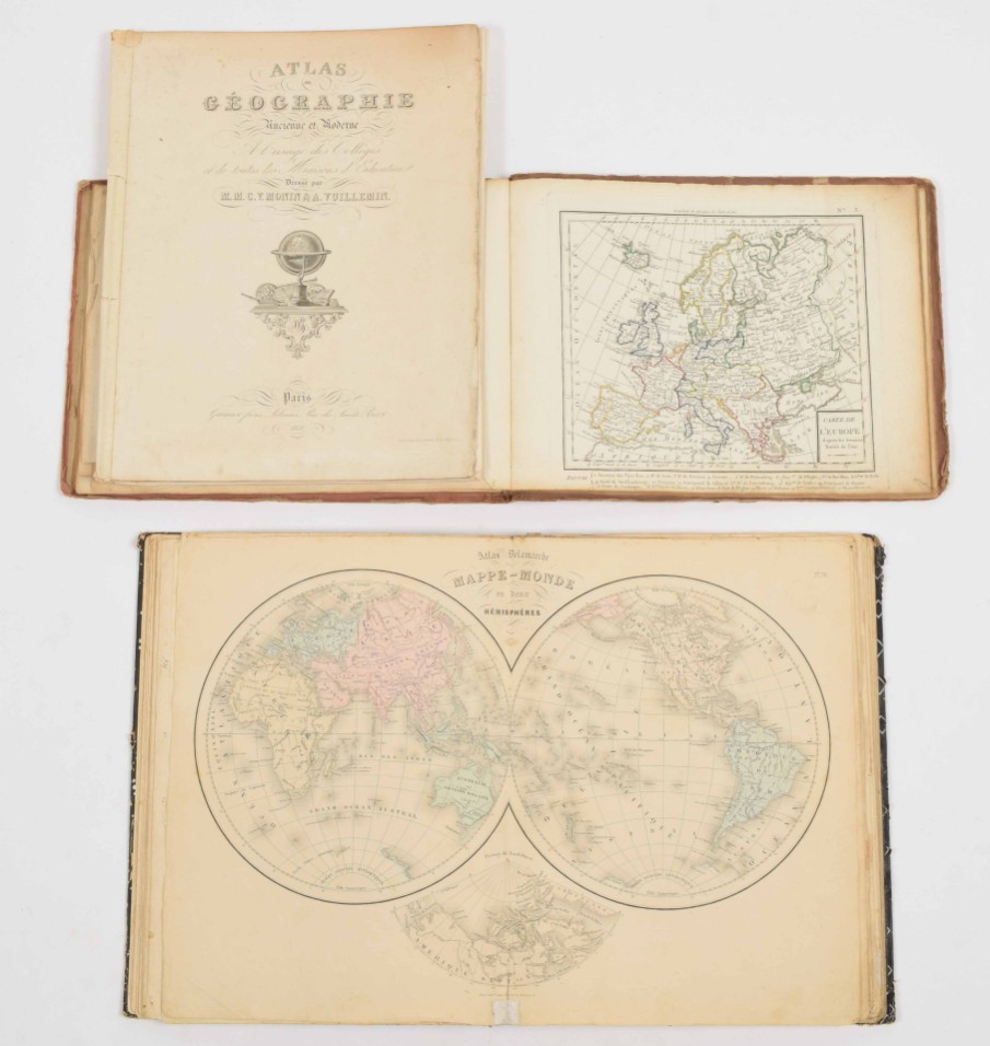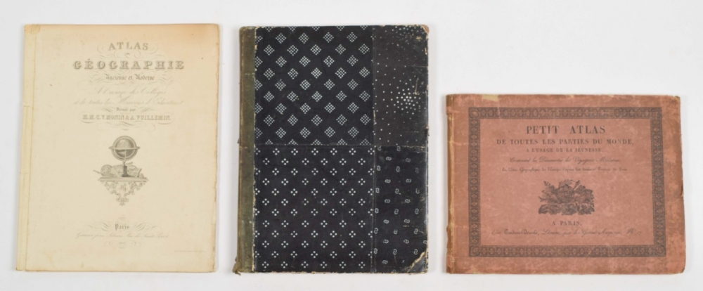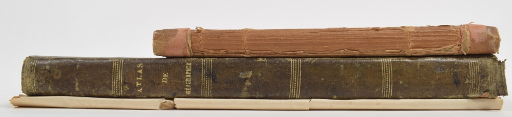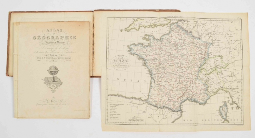A l'usage de la jeunesse (...) d'un précis élémentaire de géographie moderne, des cinq parties du monde, et de notions sur la sphère. Madame Tardieu-Denesle. Paris, Tardieu-Denesle, 1823. 4th ed. 82, (1) p. 21 engraved (folding) maps with handcoloured outlines. Original printed wrappers, oblong. Bookplate to upper pastedown, map no. 7 cut sl. short in right-hand margin with some loss to legend. Wrapper worn, part of backstrip loose, hinges splitting + Atlas de géographie ancienne et moderne. M.M.C.V. Monin & A. Vuillemin. Paris, Garniere Frères, 1852. Index page and 16 (of 42) loose engraved (folding) maps with handcoloured outlines, some with small engraved views in the margin of the map. Original engraved front wrapper, unbound, 34 x 26 cm. Occ. spotting, wrapper worn - and 1 more.