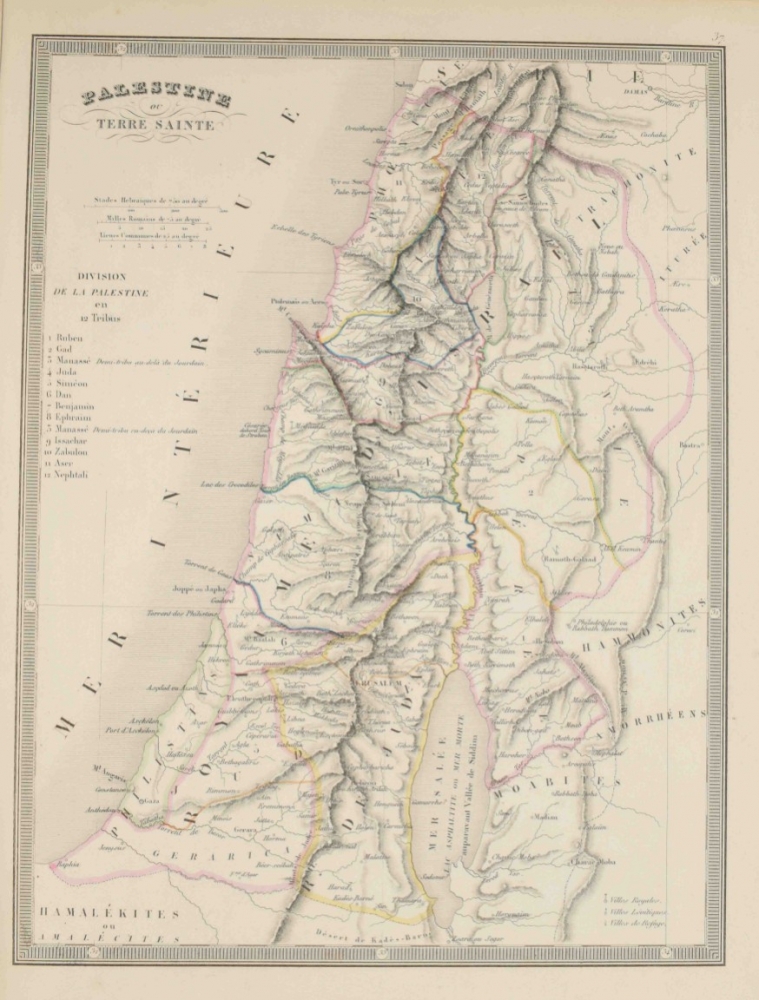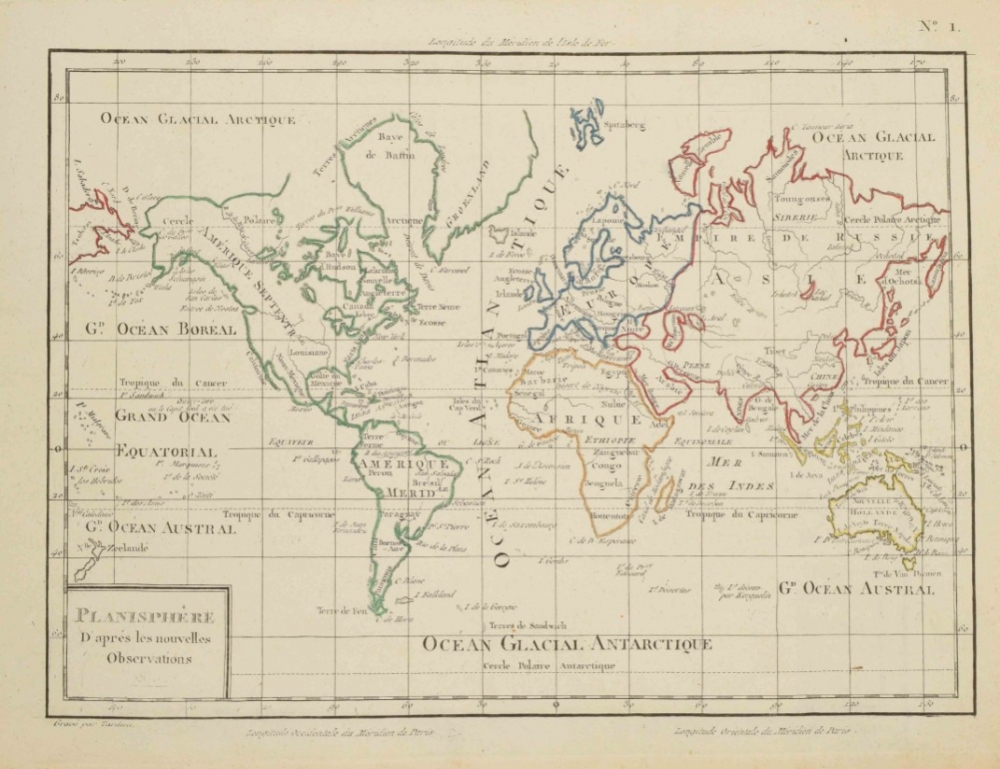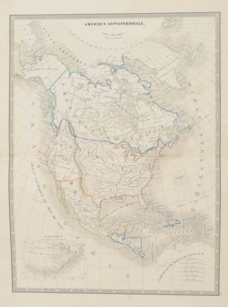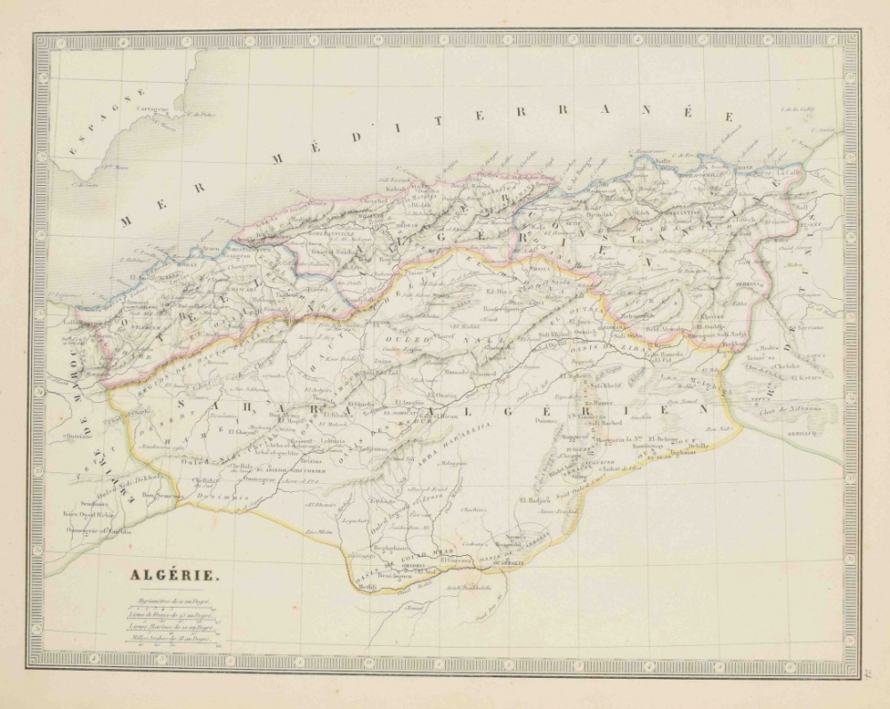 A l'usage de la jeunesse (...) d'un précis élémentaire de géographie moderne, des cinq parties du monde, et de notions sur la sphère. Madame Tardieu-Denesle. Paris, Tardieu-Denesle, 1823. 4th ed. 82, (1) p. 21 engraved (folding) maps with handcoloured outlines. Original printed wrappers, oblong. Bookplate to upper pastedown, map no. 7 cut sl. short in right-hand margin with some loss to legend. Wrapper worn, part of backstrip loose, hinges splitting + Atlas de géographie ancienne et moderne. M.M.C.V. Monin & A. Vuillemin. Paris, Garniere Frères, 1852. Index page and 16 (of 42) loose engraved (folding) maps with handcoloured outlines, some with small engraved views in the margin of the map. Original engraved front wrapper, unbound, 34 x 26 cm. Occ. spotting, wrapper worn - and 1 more.