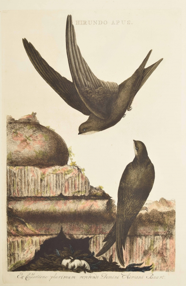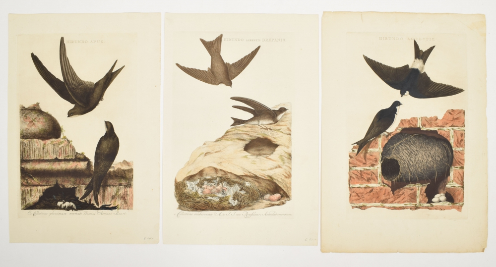 1. Hirundo Apus [Gier-Zwaluw]; 2. Hirundo Agrestis Drepanis [Oever-Zwaluw]; 3. Hirundo Agrestis [Boeren-Zwaluw]. Handcoloured copper engravings, all 42 x 27 cm., original colouring, on thick paper with wide margins.