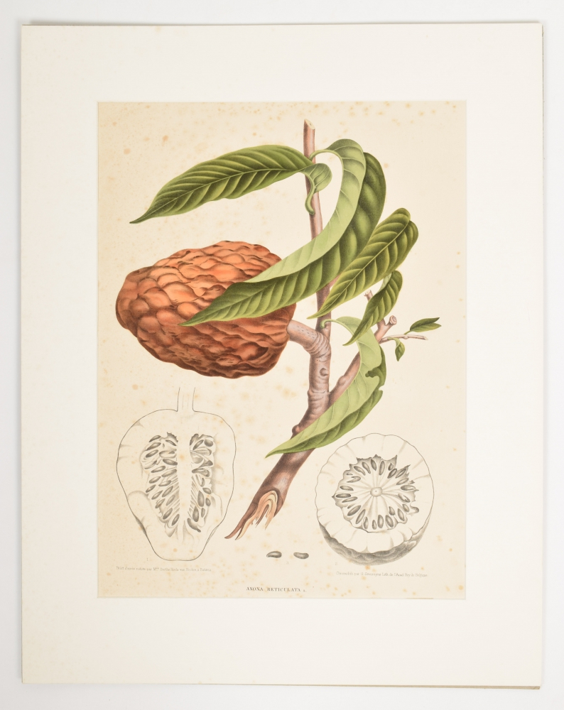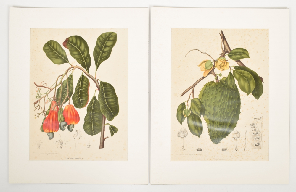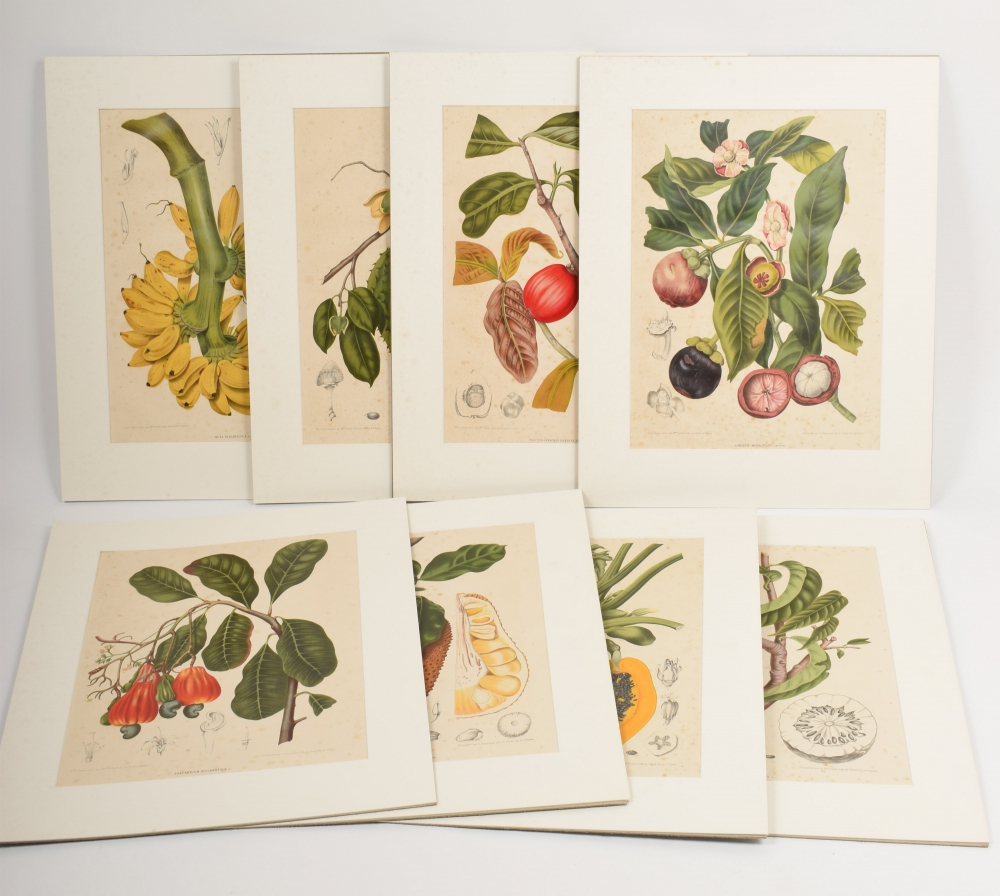 1. Musa Paradisiaca. 2. Anona Muricata. 3. Fructus Jambosae Domesticae. 4. Garcinia Mangostana. 5. Anona Reticulata. 6. Carica Papaya. 7. Artocarpus Polyphema. 8. Anacardium Occidentale. The 8 chromolithographs from Fruits et Feuillages Choisis de la Flore et de la Pomone de L'ile de Java. Emile Tarlier. Brussels. 1863. The chromolithographs by G. Severeyns after Berthe Hoola van Nooten. Printed by P. Depannenmaeker. The beautifully finished prints with small stains. Scarce.