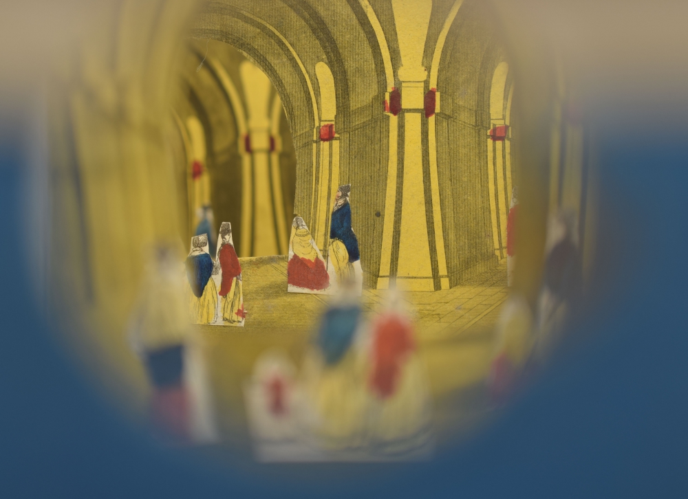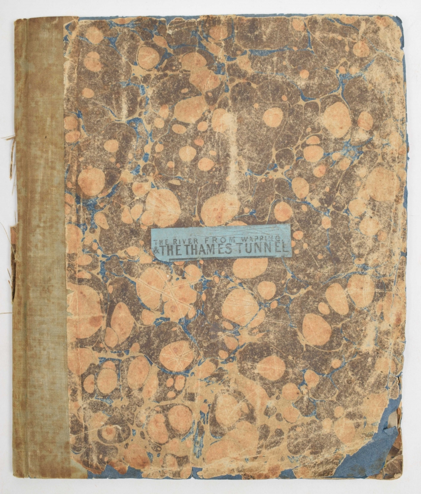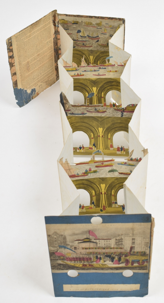 A view of Rotherlithe from Wapping [and perspective view of the tunnel below the Thames]. Colourlithographic peepshow interior with handcoloured illustration "Wapping Intrance", no date or place, c. 1850, and 4 sections of 20 x 16 cm., each with top and bottom scene, connected by thin paper segments, the whole extendable like an accordeon up to a depth of ± 60 cm. Published in the original wrapper with French explanation on inside wrapper. The wrapper and bottom part of the French text with damage. Peepshow complete and good.