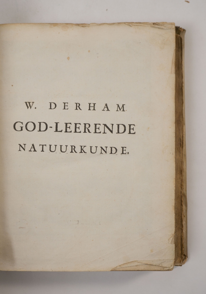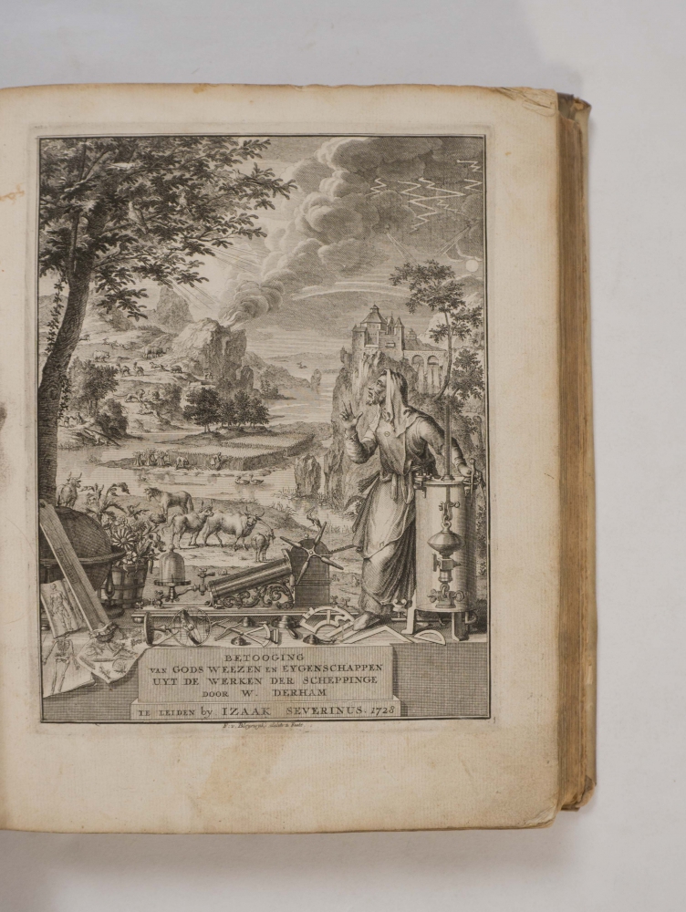 of Eene betooging van Gods wezen en eigenschappen uit de beschouwing van de werken der scheppinge. Met keurlyke aanmerkingen en beproefde waarneemingen. Door (...) William Derham (...). Dienende tot opheldering van B. Nieuwentyt Wereldbeschouwing. Volgens den lesten Engelschen druk vertaalt door Abraham van Loon (...). Leiden, I. Severinus, 1728, (32),476,(18) p., with engraved frontispiece by F. van Bleyswyk, engraved title vignette and 22 illustrations on 1 folding, engraved plate, contemporary blindstamped vellum, 4to.