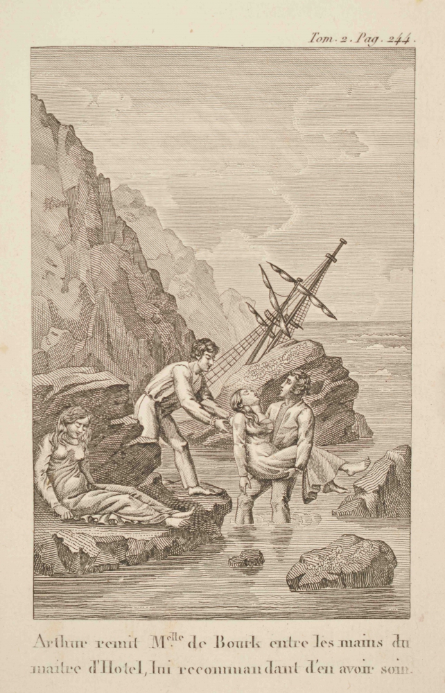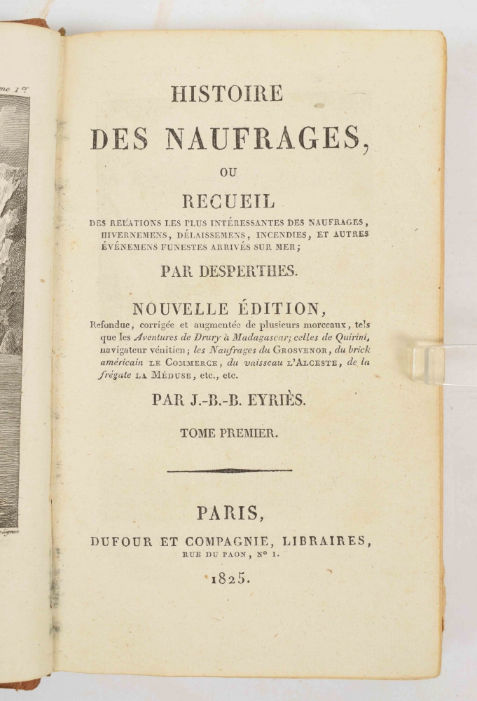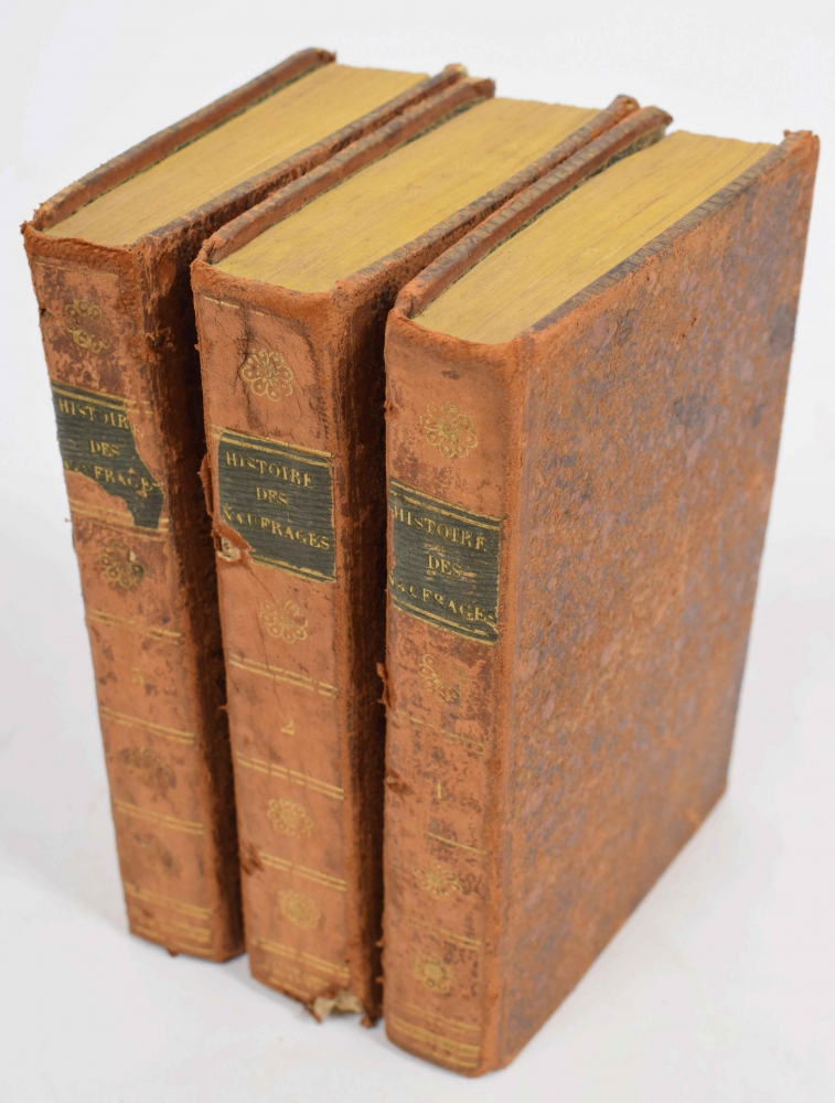 Jean Louis Desperthes. Paris, Ed. J.B.B. Eyriès, 1825 (1781). 12vo, 3 parts in 3 vols. In leather with marbled endpapers. 400; 468; 390 pp. Each vol. contains a frontispiece and a plate with an engraving of a historical shipwreck by engravers De Lignon, Dupréel and Boulot, after work by Nicolas Gosse.
