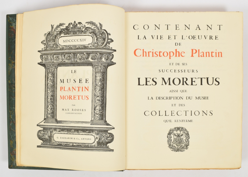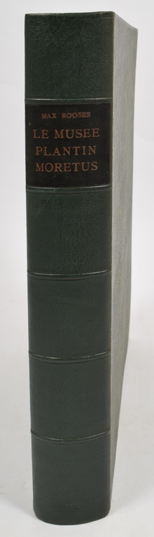 Le Musee Plantin-Moretus. Contenant la vie et l'oeuvre de Christophe Plantin et de ses successeurs Les Moretus ainsi que la description du musée et de ses collections qu'il renferme. Max Rooses. Antwerp, G. Zazzarini & Co. [printed by J.E. Buschmann], 1914. Large folio (54 x 32 cm.). Faux-leather, title on spine in black and gilt stamping, marbled endpapers, title in red and black, (10),407,(10) pp., 37 full-page plates with 59 copper engravings and 16-full page plates in woodcut. These plates printed from originals kept at the museum; also more than 300 illustrations inside and outside the text.