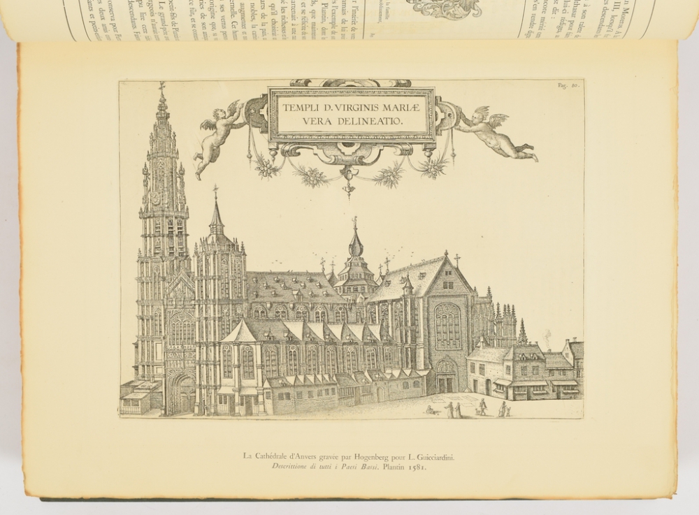 The engravings, woodcuts and illustrations are impressions from famous publications, such as Guicciardini's town boek, de la Serre's 'Entrée de la Reyne-Mère du Roy très Chrestien' from Les villes des Pays-Bas'. Title pages by Rubens, woodcuts in chiaroscuro by Goltzius from his Icones Imperatorum, Antwerp, 1645. At the front an inserted double page [1955] with dedication to Achiel van Acker, Prime Minister, in memory of his visit to Antwerp, on behalf of the College van Burgemeester en Schepenen van Antwerpen; with signatures of secretary K.C. Peeters and mayor L. Craeybecks.