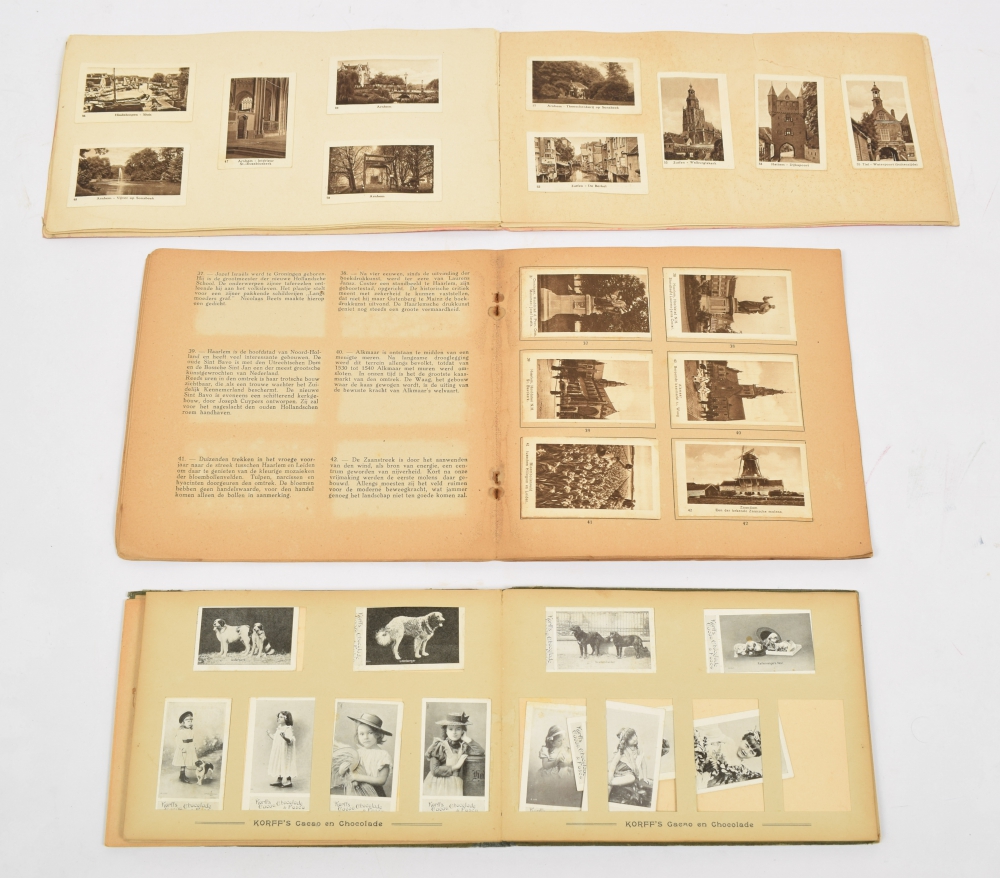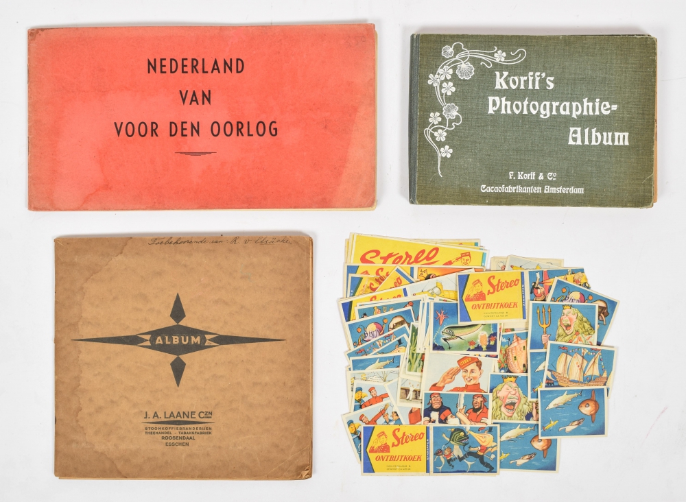Album J.A. Laane CZN Stoomkoffiebranderijen Theehandel-Tabaksfabriek, Roosendaal, Esschen, c. 1925. Complete with 80 picture cards + Korff's Photographie-Album F. Korff & Co, Cacaofabrikanten, Amsterdam, c. 1905. With 89 of 94 zwartjes. Several picture cards trimmed, most with Korff advertising on edge + Nederland van Voor den Oorlog. Album with a series of 80 topographic picture cards. Added 75 single (partly double) picture cards and (rare) strips incl. side pictures of Piccolo, Stereo ontbijtkoek.