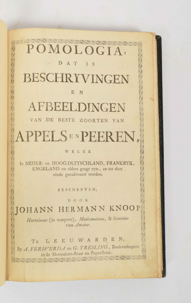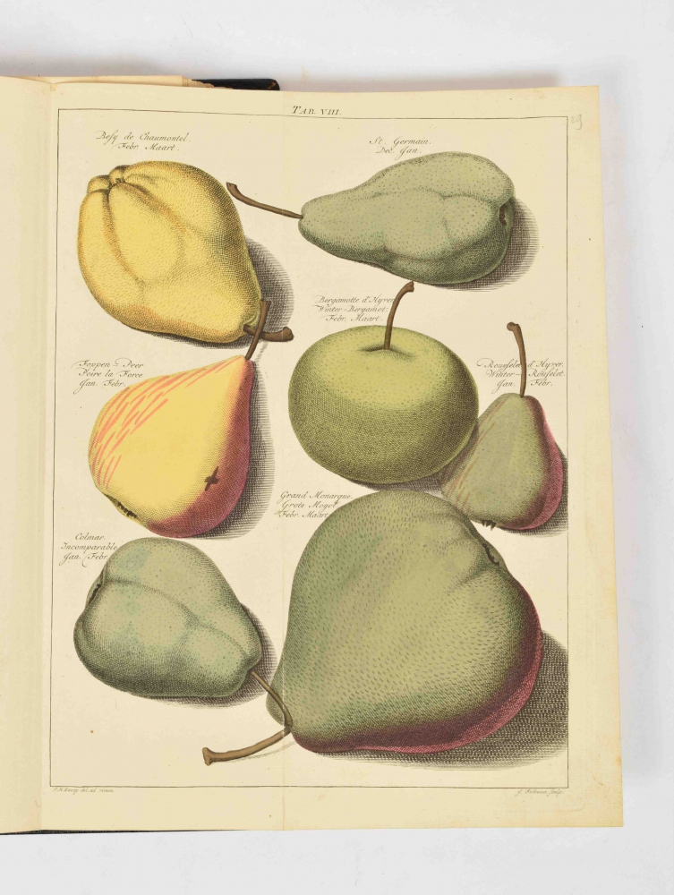 van de beste zoorten van Appels en Peeren, welke in Neder- en Hoog-Duitschland, Frankryk, Engeland en elders geagt zyn, en tot dien einde gecultiveert worden. Johann Hermann Knoop. Leeuwarden, A. Ferwerda en G. Tresling, [1790] + Fructologia of beschryving der vrugtboomen en vrugten + Dendrologia of beschryving der Plantagiegewassen. 3 parts in one volume. Small folio, in 20th-century faux-leather binding with ribbed back, in cassette. 36,(2),69,(2),87,(4) pp. complete with all 39 (VIII,XII,XIX) handcoloured copper engravings in the first two volumes. Plates in lovely colouring, both text and plates bright.