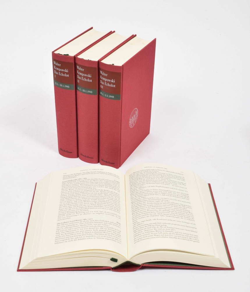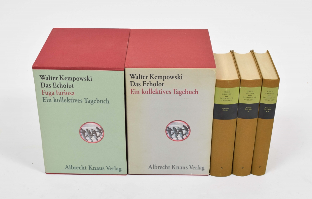 Walter Kempowski. Das Echolot: ein kollektives Tagebuch I-IV (1.1.1943 - 28.2.1943). 2. Auflage. Munich, Albrecht Knaus, 1993. Cloth, 4 vols. in slipcase + Walter Kempowski. Das Echolot: Fuga furiosa, ein kollektives Tagebuch I-IV (12.1.1945 - 14.2.1945). 1. Auflage. Munich, Albrecht Knaus, 1999. Cloth, 4 vols. in slipcase + Erich Kästner. Gesammelte Schriften 5-7. 3. Auflage. Zürich, Atrium, n.d. Cloth, 3 (of 7) vols.