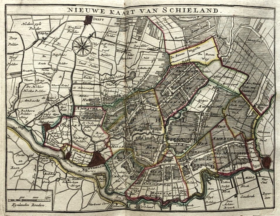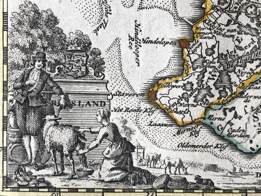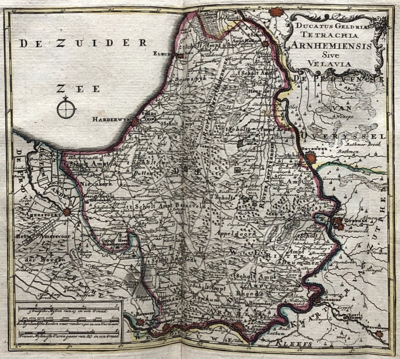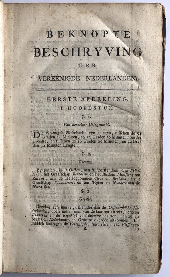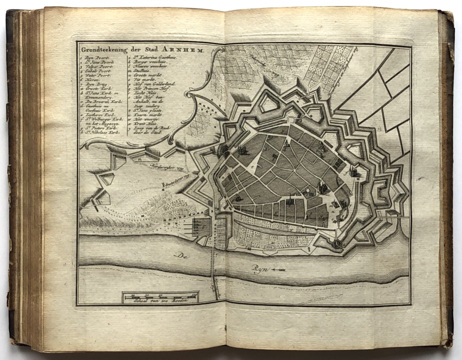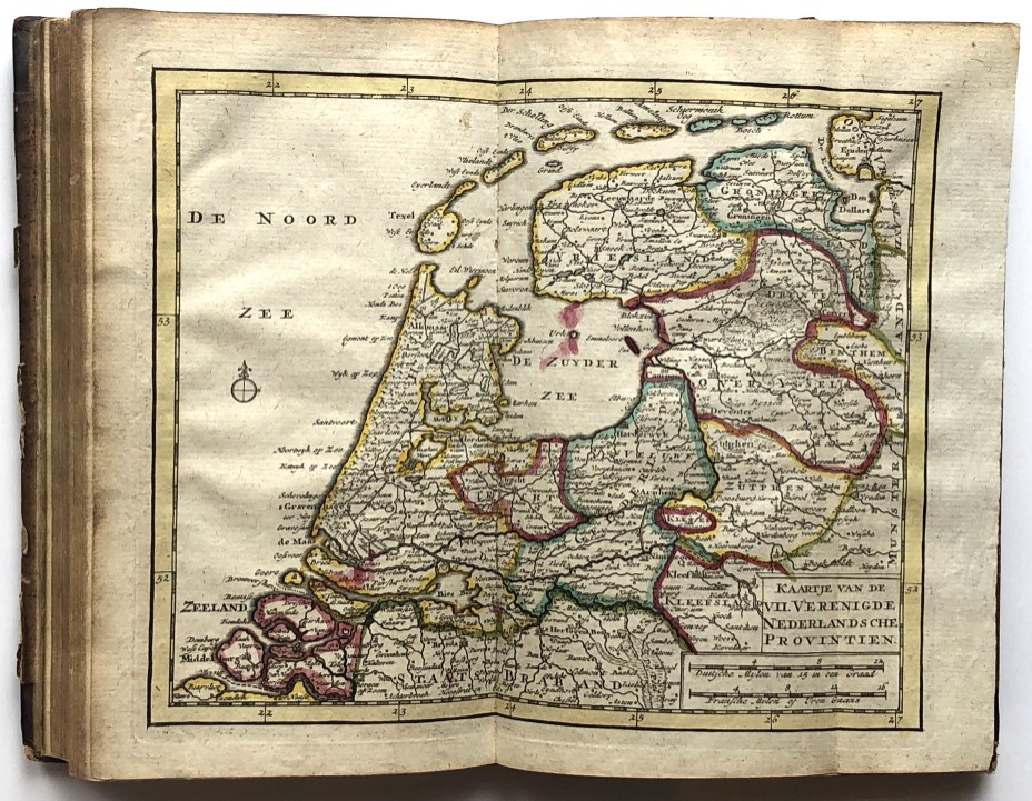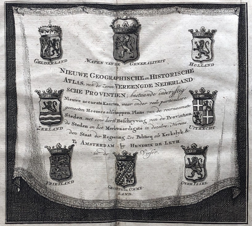 van de Zeven Vereen(i)gde Nederlandsche Provintien bestaande inde vijftig nieuwe accurate kaarten (...) met een korte beschryving (...). Amsterdam, Hendrik de Leth, (c. 1760). 8vo, half leather, title vignette on spine, folding engraved title with the coat of arms of the Generality and the 7 provincial arms, 156,(3) pp. and 27 (of 53) maps, plans, city charts and flag chart. Shabby binding. The 24 folding maps and 3 folding plans in very good condition. Maps, city charts and flag chart in original colouring.