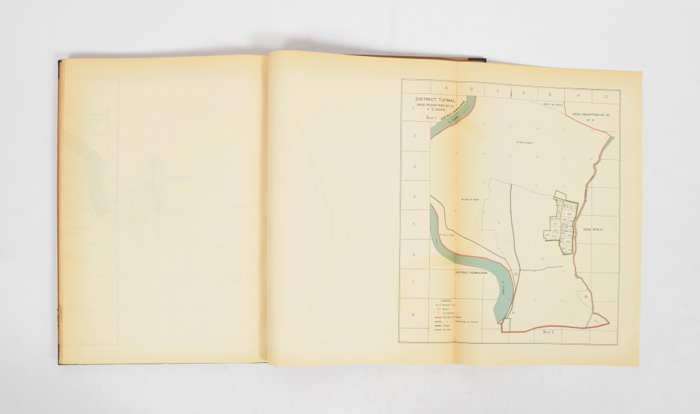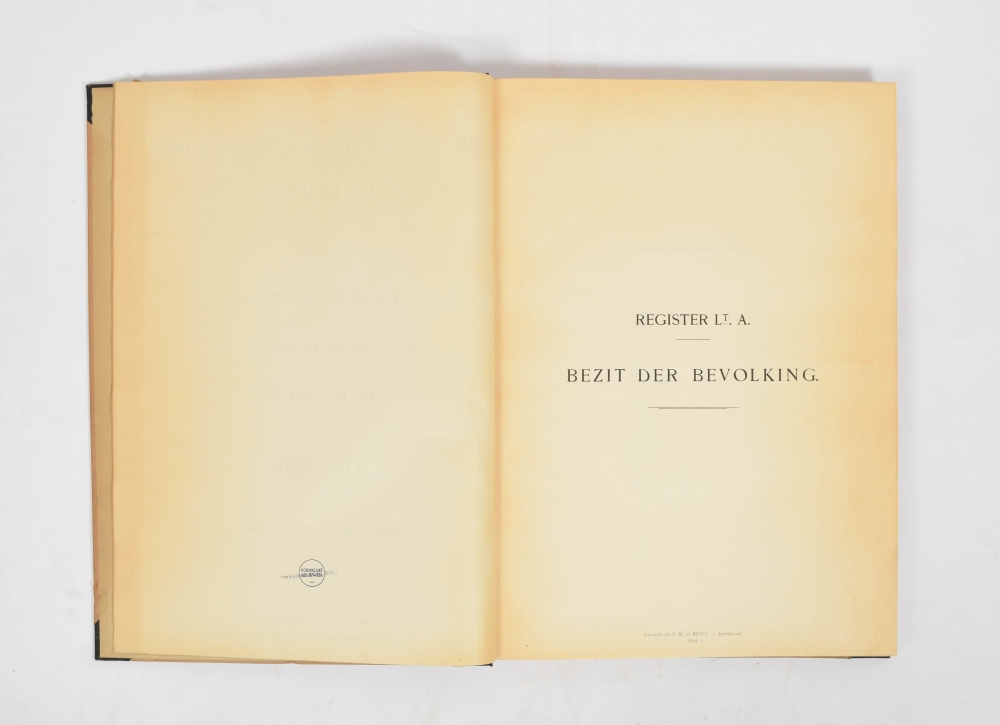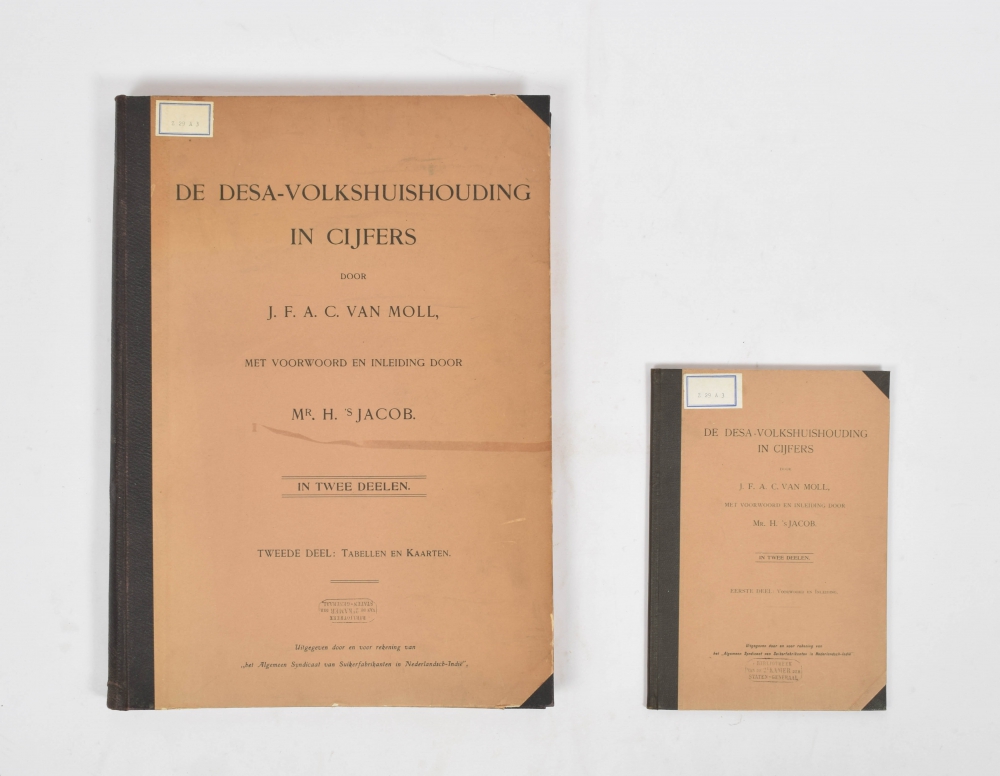 J.F.A.C. van Moll met voorwoord en inleiding door Mr. H. 's Jacob in twee deelen. Uitgegeven door en voor rekening van het "Algemeen Syndicaat van Suikerfabrikanten in Nederlandsch-Indië", J.H. de Bussy, 1914. In halfcloth. First vol. 4to, 80 pp. Second vol. folio. 335 pp. with 25 folding maps. Stamped front library Tweede Kamer.
