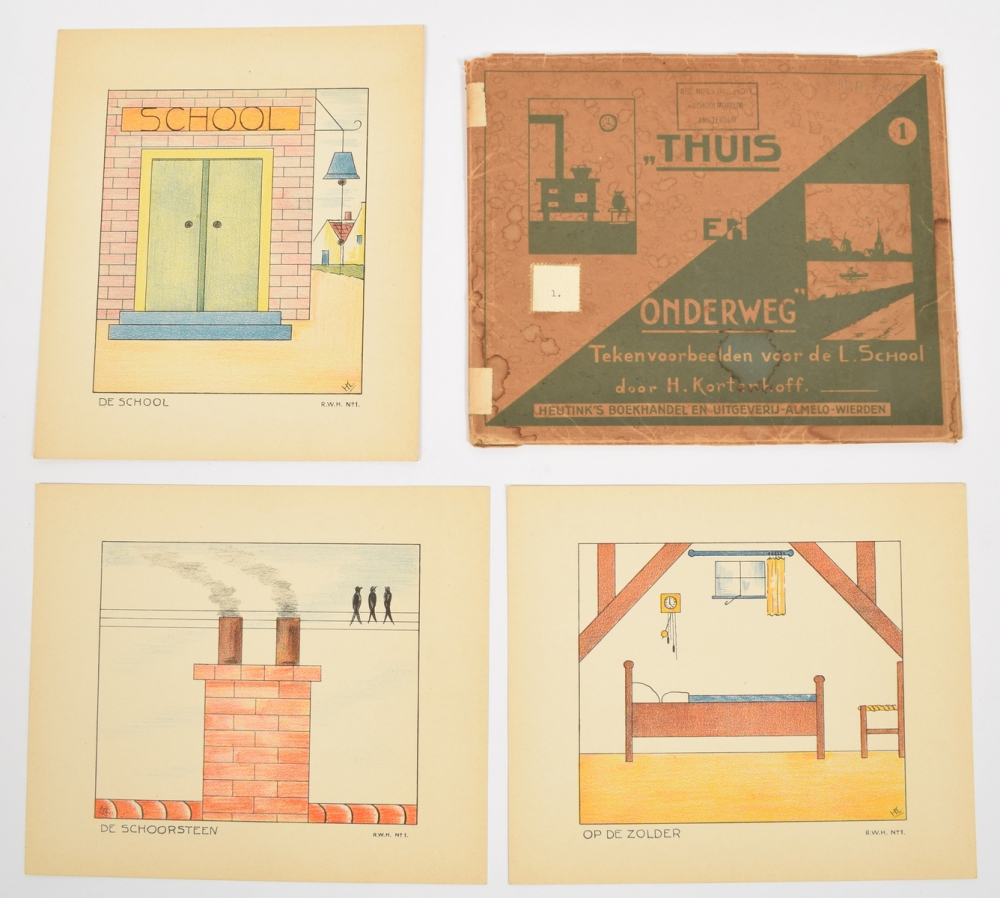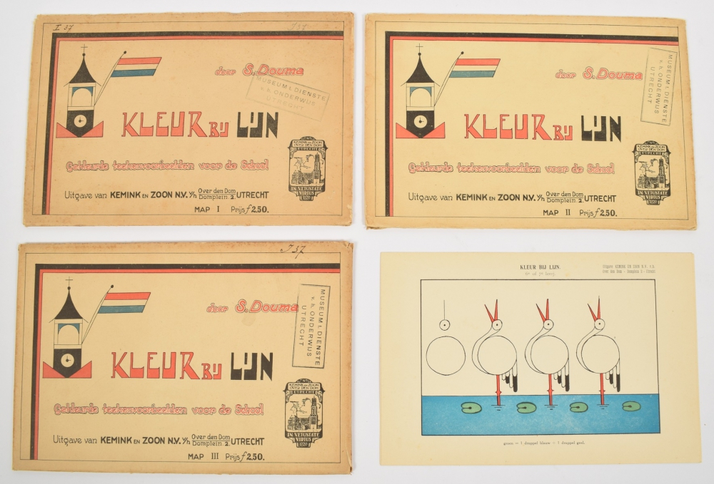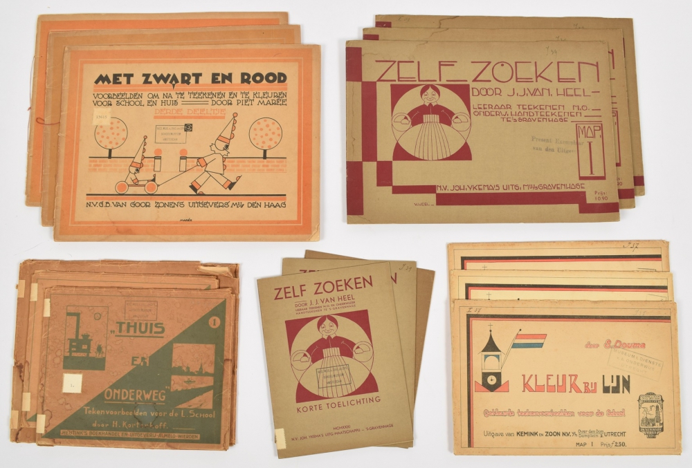 Wrappers vaguely waterstained in top corner, the three main parts with stamp "Present Exemplaar van den Uitgever", the identical explanation vols. with library stamps/ labels of the Schoolmuseum Amsterdam. Very rare, complete set of this finely designed drawing course; (2) Met zwart en rood. Voorbeelden om na te teekenen en te kleuren, met behulp van lineaal, passer of knoopen enz. Door Piet Marée. The Hague, Van Goor Zonen, n.d. (1930), three vols. with each 16 p. of drawing examples and unused grid paper, original uniform cordbound wrapper, oblong folio. First vol. bookblock loose, all vols. with scattered stamps of the Schoolmuseum Amsterdam and "Presen-Exemplaar van den Uitgever". And with another 2 similar, very rare sets of 3 files by S. Douma and H. Kortenhoff (the latter not in PiCarta). (total 4 sets of 3 files)