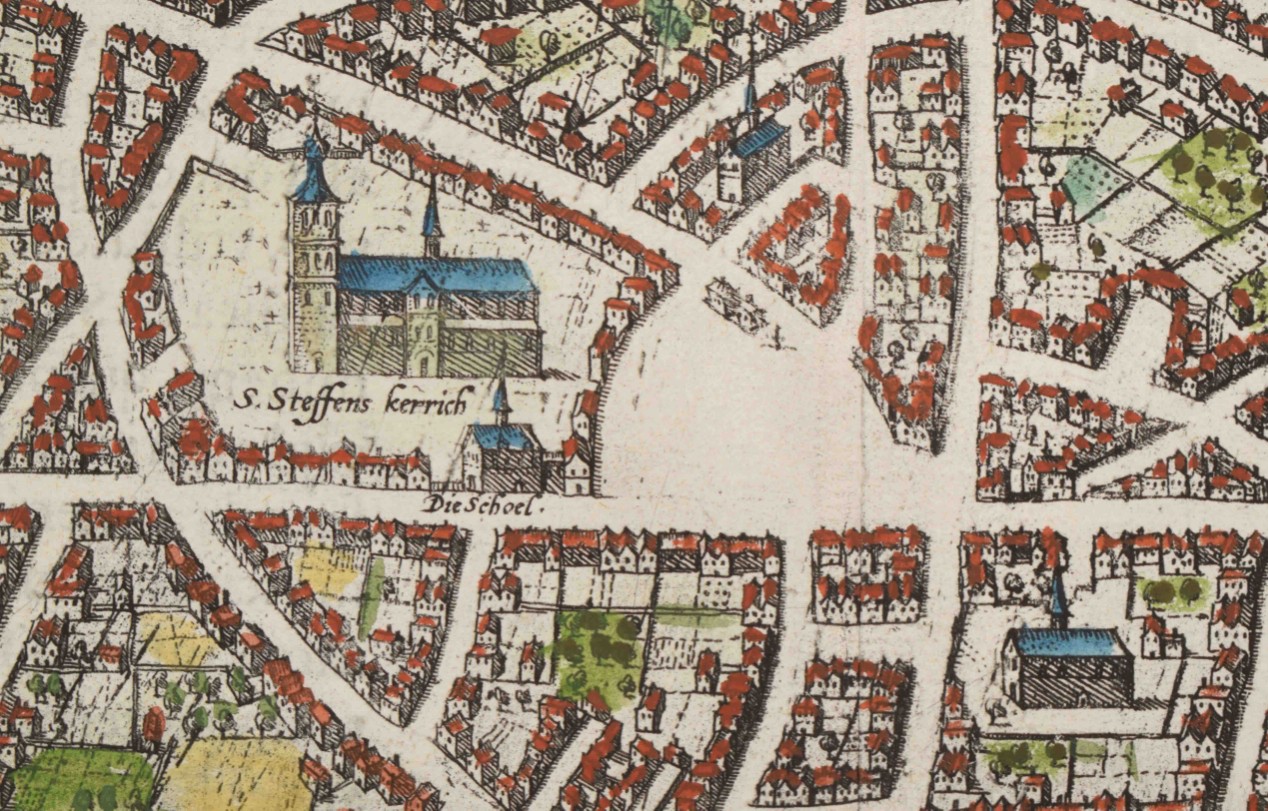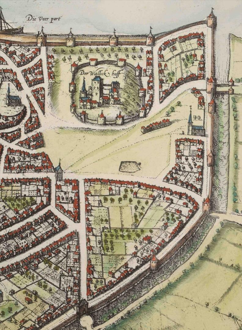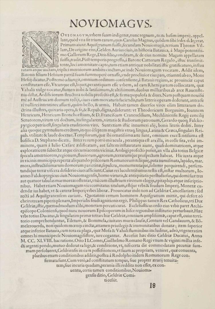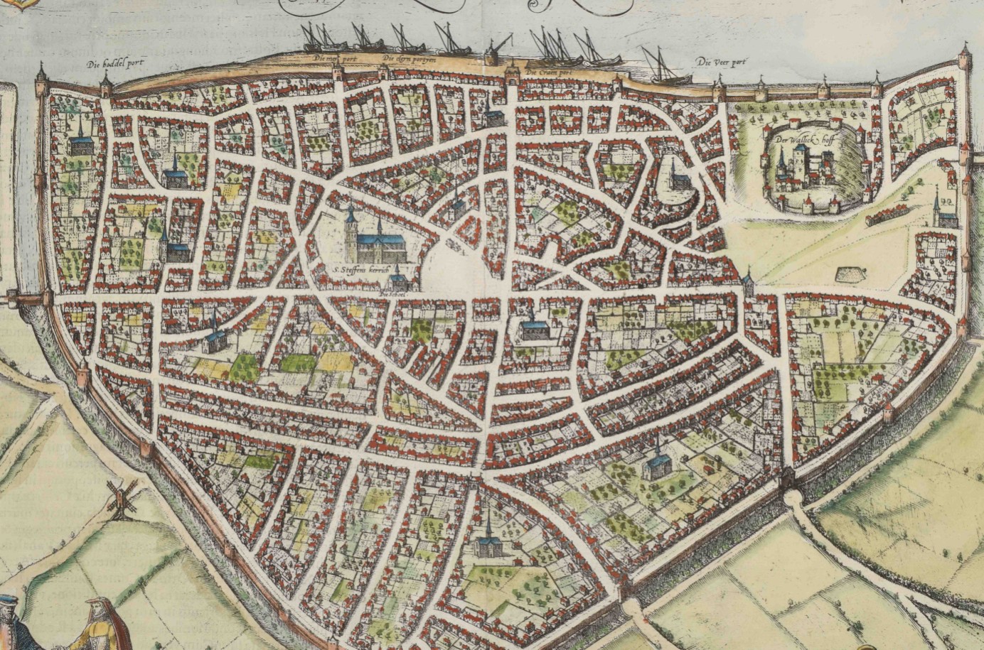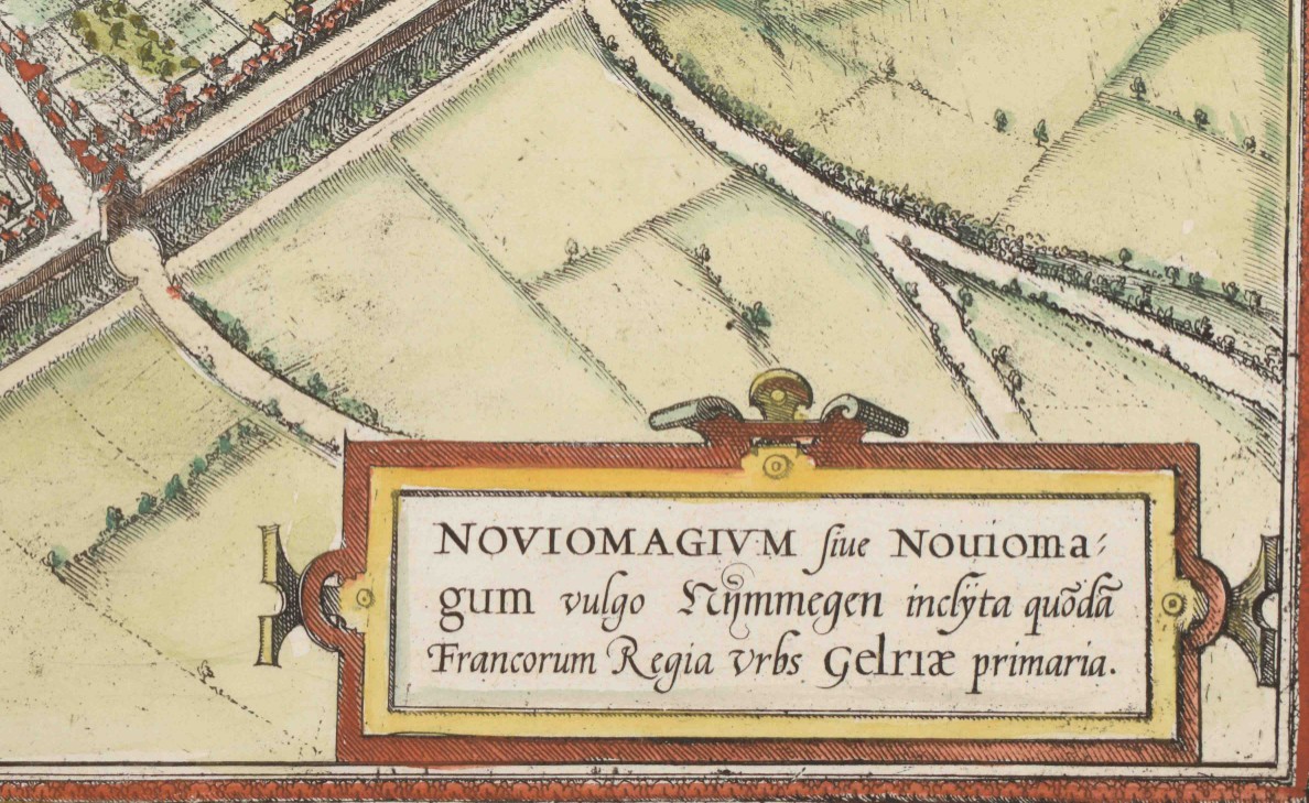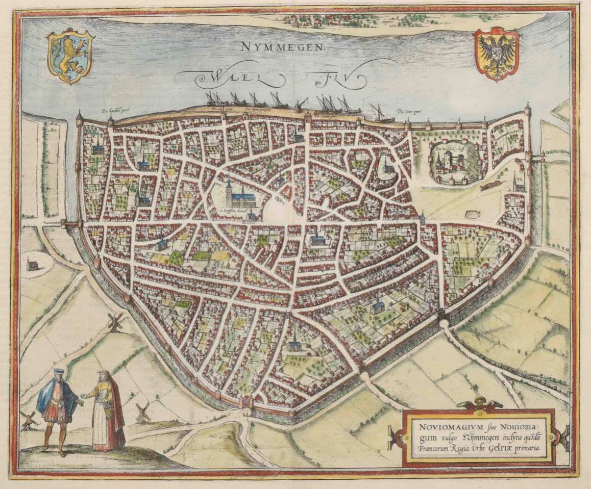 Noviomagium sive Noviomagum vulgo Nijmmegen (...). Handcoloured, etched and engraved bird's-eye view plan from Braun & Hogenberg, Civitates Orbis Terrarum, c. 1600. 33 x 39.5 cm.