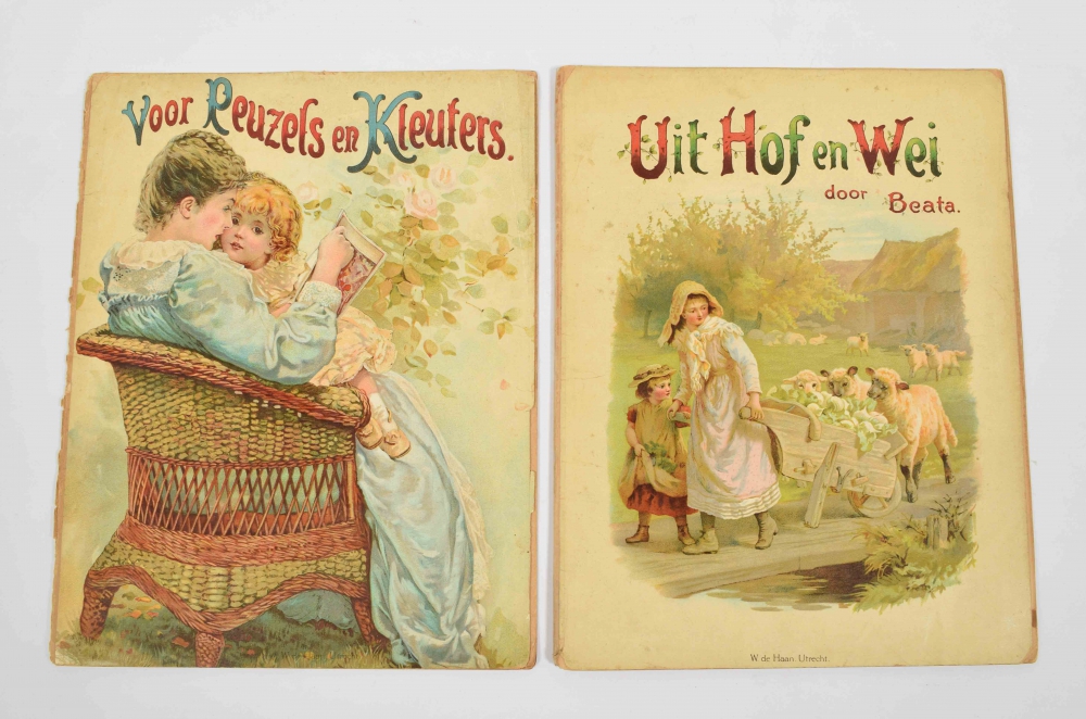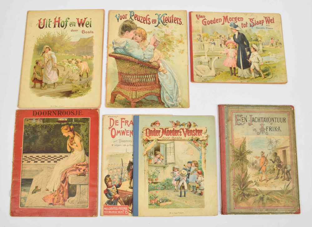 Van Goeden Morgen tot Slaap Wel. Henriëtte Blaauw, Kluitman, Alkmaar, c. 1910. Oblong, 24 pp. A few pp. restored + Een Jachtavontuur in Afrika. Met 14 platen in kleurendruk. J. Vlieger, Amsterdam, c. 1887. Loose in binding, binding sl. stained + Uit Hof en Wei door Beata. W. de Haan, Utrecht, c. 1900. 18 pp. with 7 full-page lithographs of which the middle plate in 2 pages - and another 4 children's picture books + De Drie Kleuren. J. Altink, J. Boer. 16 tekenvoorbeelden voor de lagere klassen der lagere school. 3rd ed. J.B. Wolters, Groningen, 1947 + 16 Teekenvoorbeelden voor de middelklassen der lagere school. II, 3rd ed., 1947 + Zóó Rekenen Wij! Author and publ. unknown, c. 1900. 10 pp. Restored along spine and edges + Dieren Kleurboek. Konrad Mullerfurer. W. de Haan, Utrecht, 1921. Clean copy + J. van Dijck's Teekenvoorbeelden 1e-5e boekje. Amsterdam, S.L. van Looy, c. 1920 - and the 2nd edition of this series - and 12 more incl. 2 incomplete colouring files.