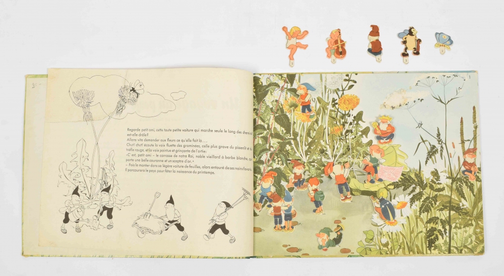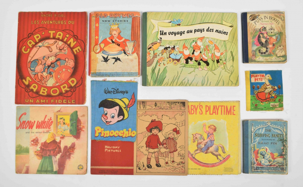 Puss in Boots illustrated by Kathleen Hale. A Peepshow Book. 6 scenes in pop-up, opening into carousel-shape. Folding Books , London, c. 1947. Traces of use to boards, interior good + The Sleeping Beauty. Illustrated by Roland Pym. Peepshow book (idem) + Old Rhymes and new stories. Bookano living pictures series. With pictures that stand up lifelike when the book is opened. With 3 pop-ups. Circa. 1935 + Snow-White and the Seven Dwarfs. Collana Rosa d'Oro, Milano, c. 1950. 19 pp. With pop-up on inside front board + 3 cloth books in English - and 3 more added.