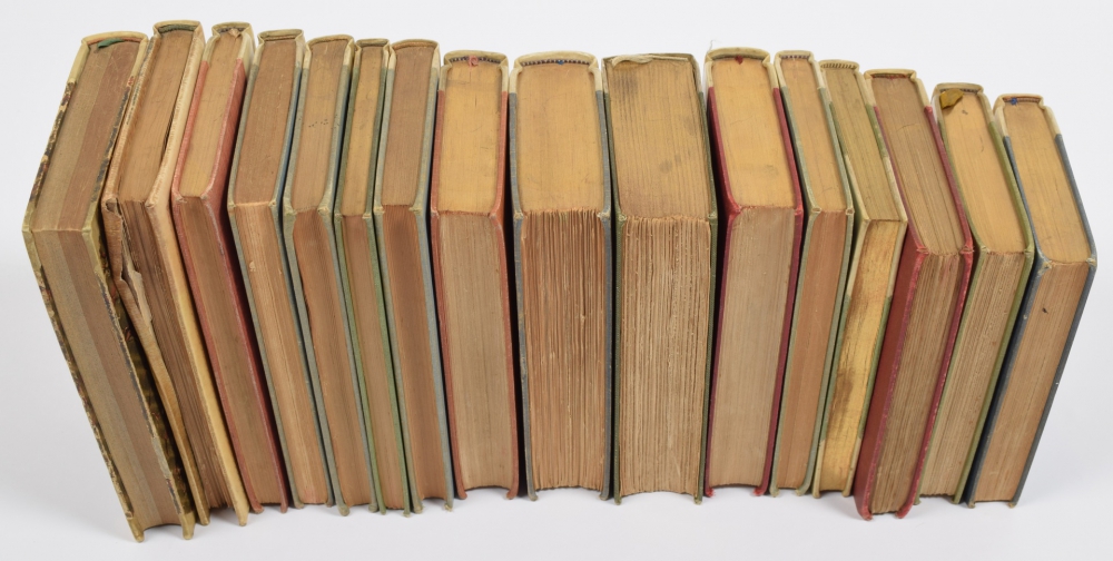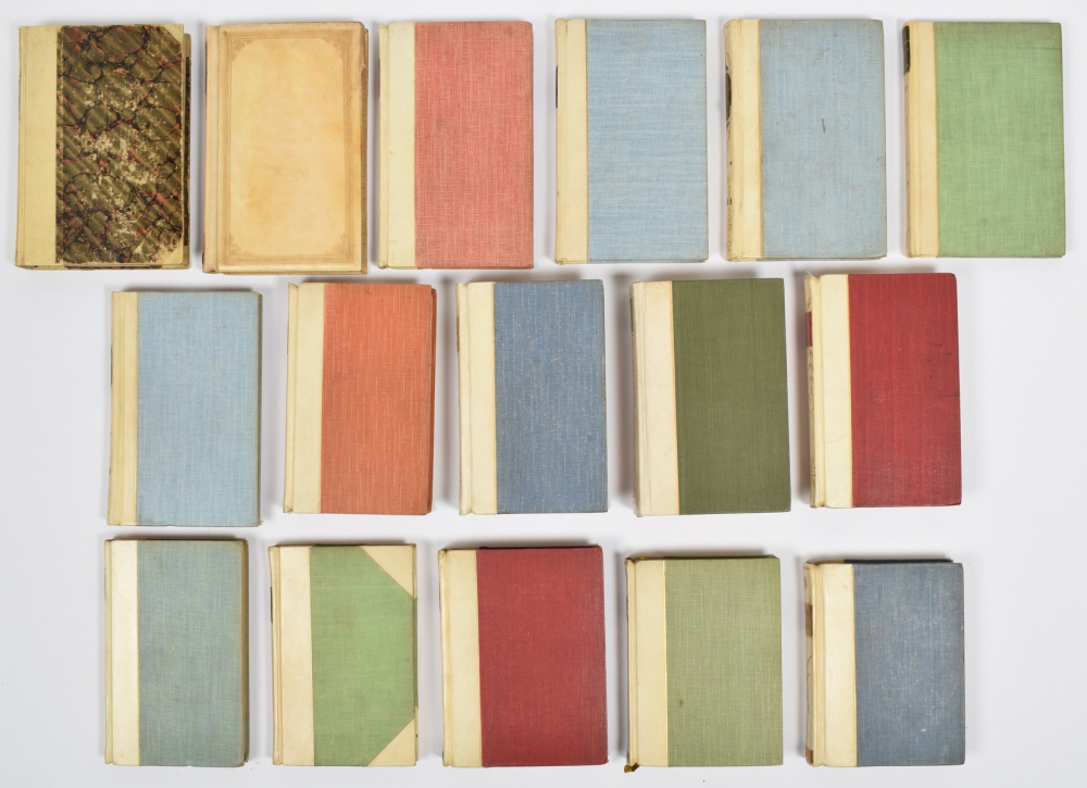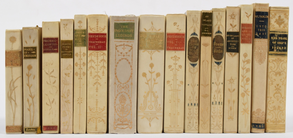 Contains 5 parts from the series "The World's Classics" (Thackeray in 2 vols., Borrow, Lamb and Ingoldsby), 4 works by John Ruskin (1 in full vellum with bookplate of Constance Flower), also The Pearl of Orr's Island (...) by Harriet Beecher Stowe (London, 1861, 1st ed.?) and Inland Voyage by Robert Louis Stevenson (1907, frontispiece by W. Crane, school prize of the Harrow School to inside front board), and poems by A.L. Gordon, F. Leighton, R.W. Emerson, M. Arnold (bound by Riviere & Son and with pasted mark of Goulden & Curry) and G. Herbert. (total 16)