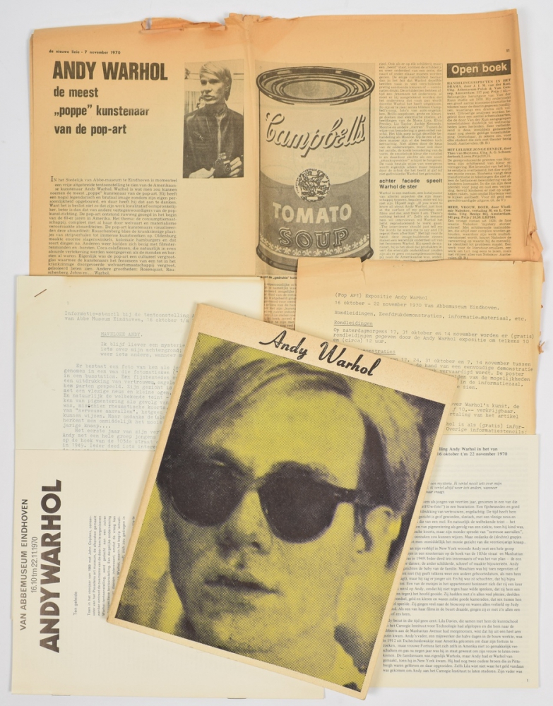 Copy of the scarce, divergent edition for the Van Abbemuseum, which in 1970 was allowed to take over an exhibition organised by John Coplans in the United States: (2) Van Abbemuseum Eindhoven 16.10 tm 22.11.1970. Andy Warhol. Exhibition catalogue with text by John Coplans, catalogue design Jan van Toorn. Eindhoven, Van Abbemuseum, 1970, 16 p. incl. original stapled wrapper, 4to. On p. 16 a reference to the aforementioned book; (3) Information stencil for the exhibition Andy Warhol at the Van Abbe Museum Eindhoven, 16 October until 22 November 1970. With the text "Haveloze Andy" by Calvin Tomkins. 17 A4 leaves stencilled on one side, stapled; (4) The printed version of the aforementioned stencil, 15 p., stapled; (5) Stencilled museum flyer with information on the exhibition, tours, screen printing demonstrations, and the other items in this lot, 1 one-sided A4 leaf; (6) Newspaper article with review of the exhibition. (total 6)