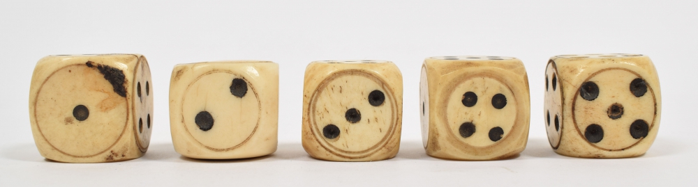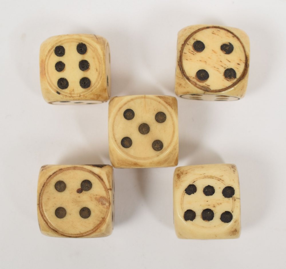 Lot with 5 handmade bone dice. Late 18th/ early 19th century.