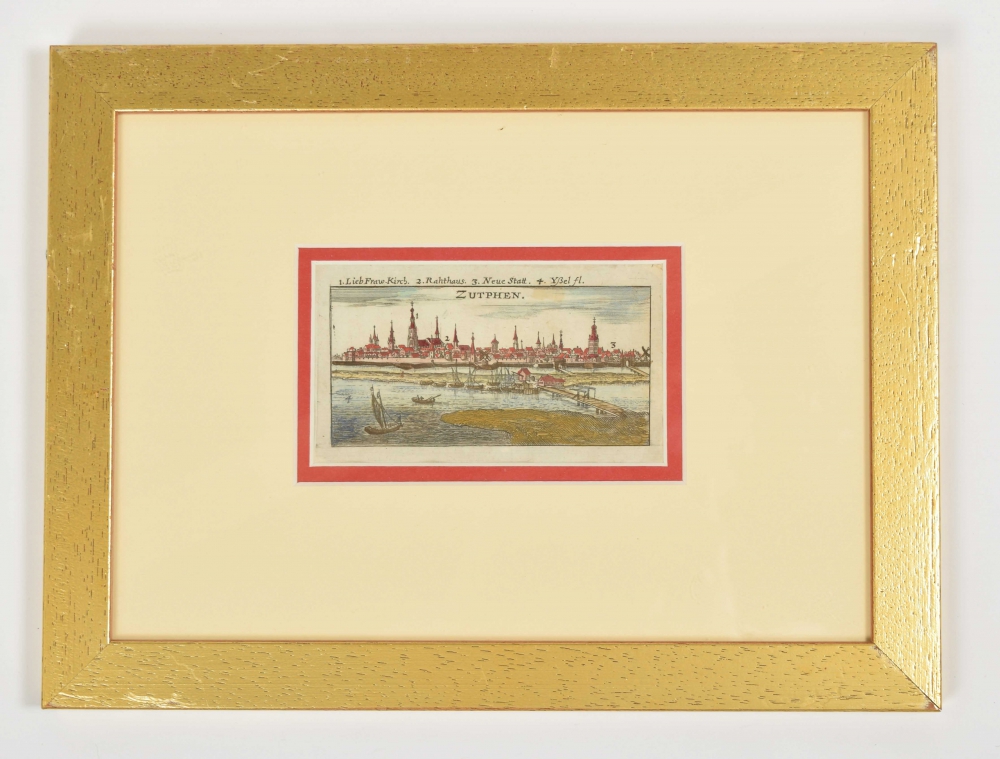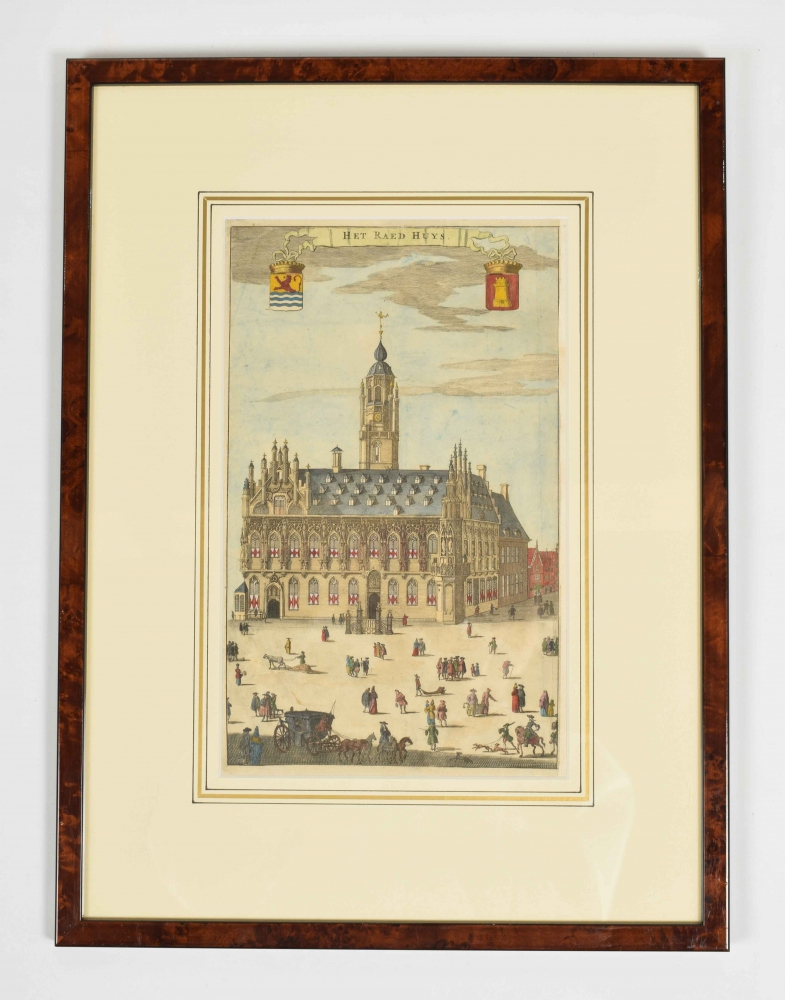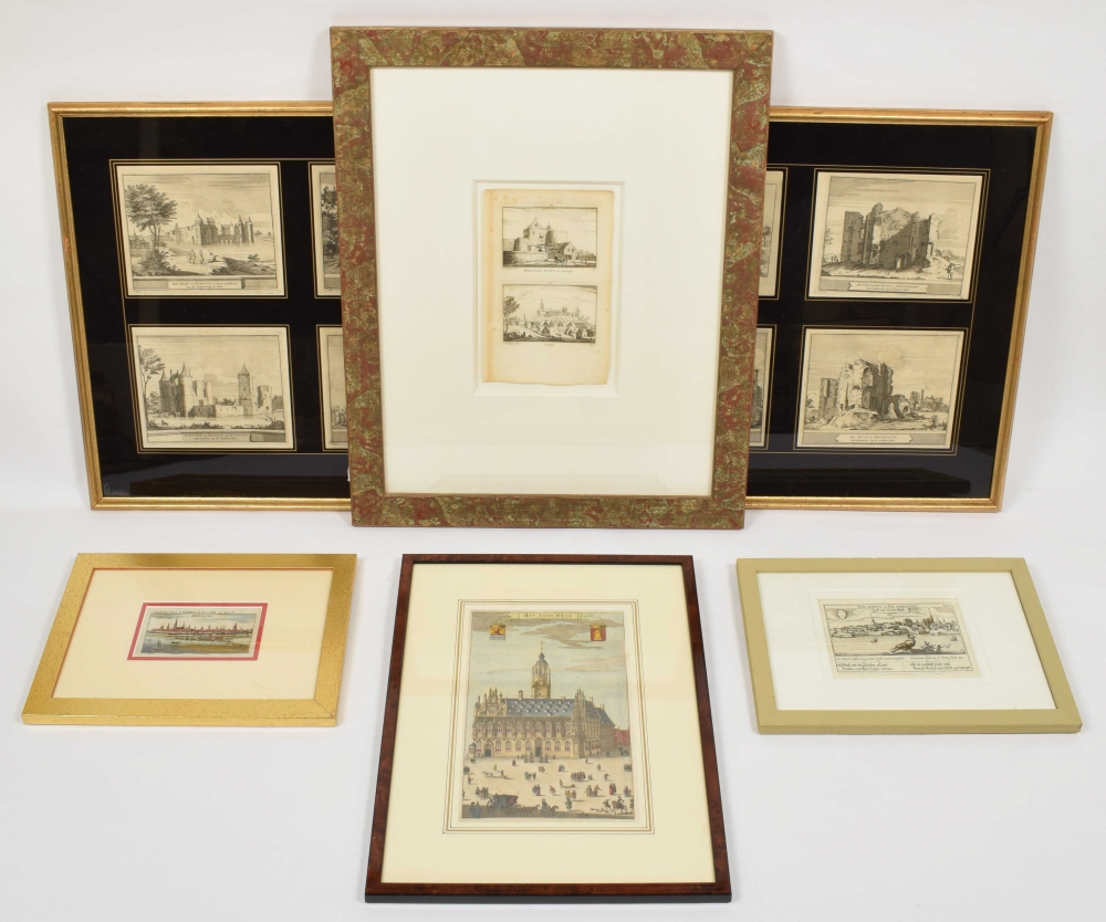 (1) Grave. Meisner. Circa 1630. Image 9.5 x 14 cm. (2) Zutphen. C. Riegel. 1691. Coloured. Image 6 x 11 cm. (3) Middelburg city hall. M. Smallegange. 1696. Coloured. Image 27 x 17 cm. (4) Egmond, 4 prints in one frame. Pieter van Winkel, from Schatkamer der Nederlandse oudheden, c. 1750. Frame 48 x 54 cm. (5) Brederode, 4 prints in one frame. The same. (6) Herstegepoort Nijmegen and Cleves. J. Rademaker. 1725. 2 prints on one leaf. Frame 57 x 46 cm. All in copper engraving.