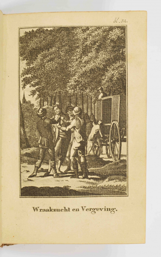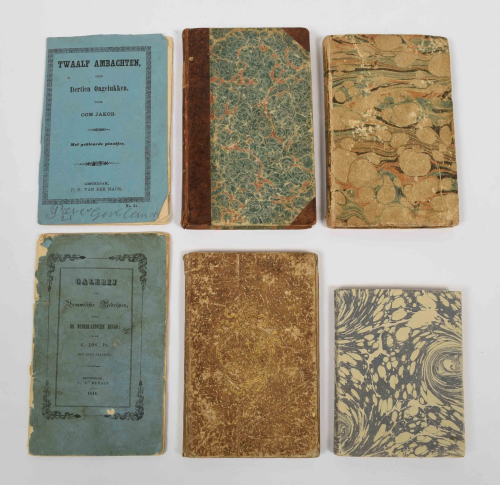 (1) Welsmakende en onschadelijke lettervruchtjes, inhoudende: aangename verhalen en nuttige onderwerpen (...) aan de leerzame en leesgierige jeugd van Nederland aangeboden. Amsterdam, H. Gartman, [1818]. 6 handcoloured copper engravings. (2) Maurits van Dallenstein. P. Joling Oz. Delft, A. van Alphen, [1837]. Title with large vignette, lithographed by Desguerrois after J. Steyn and 3 full-page copper engravings. (3) Nieuwe leerryke verhaalen. W.G. Reddingius. Dordrecht, A. Blussé en Zoon, [1815]. Title with ill. vignette + 3 full-page copper engravings. (4) Altijd gelukkig! of de geschiedenis van Feliks en zijne zuster Serena. G. Engelberts Gerrits. Amsterdam, Schalekamp, Van De Grampel en Hanssen, 1824. Title with large vignette by Hoogkamer after Oosterhuis + 2 engravings; bound with dedication to prize winner (signed in ms.). (5-6) 2 small sewn stories with paper wrapper, of which one with partly coloured pictures. All with traces of use in small 8vo and 12mo in fair to good condition.