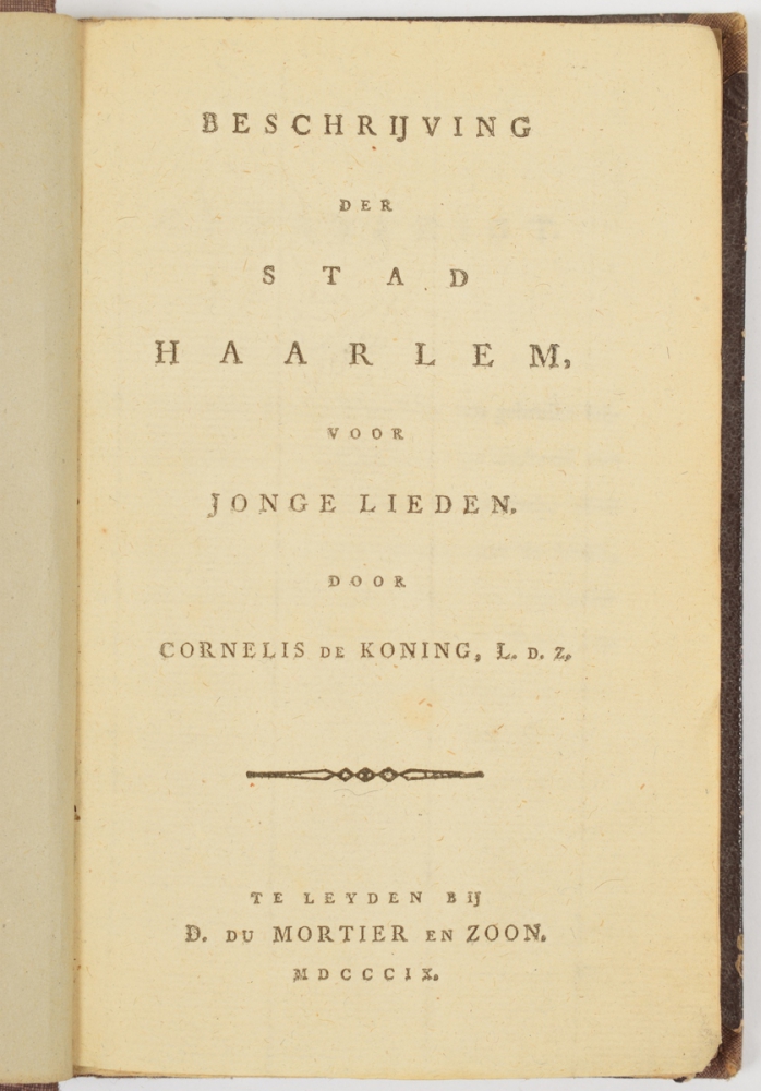 (1) Buffon voor de Jeugd. Natuurlijke geschiedenis der viervoetige dieren (trsl. by) Dr. J.A. Stamkart. Amsterdam, Hendrik Vleck, 1862. Green cloth binding, title on spine and name author on front board, title page with vignette, blindstamped boards, 8 handcoloured full-page engravings. (2) Museum voor de Nederlandsche Jeugd (...). C. van der Vijver. Amsterdam, J.C. van Kesteren, vellum, 4 handcoloured full-page copper engravings. (3) Beschrijving van de stad Haarlem voor jonge lieden. Cornelis de Koning L.d.z. Leiden, D. du Mortier en Zoon, 1809. XVI,243 pp. (4) Levensschetsen van Vaderlandsche mannen en vrouwen, uit de zuidelijke Provinciën. [H. v.d. Heuvel]. Maatschappij tot nut van 't algemeen. Leiden, Deventer & Groningen, D. du Mortier, J. de Lange & J. Oomkens, 1828, bound together with Levensschetsen van personen (...). Idem, 1838. IV,113,(2) and IV,130,(1) pp. (5) Wenken voor Opvoeding, in trekken uit de huwlijksgeschiedenissen van Willem ter Velden en de timmerman Goedhart en hunne huisvrouwen. Mij. tot nut van 't algemeen. Amsterdam, 1837. (6) Handleiding tot de schrijfkunst naar vaste regelen (...) Mij. tot nut van 't algemeen. Leiden, Deventer & Groningen, D. du Mortier, J. de Lange & J. Oomkens. All complete, several with handcoloured pictures and all with traces of use.
