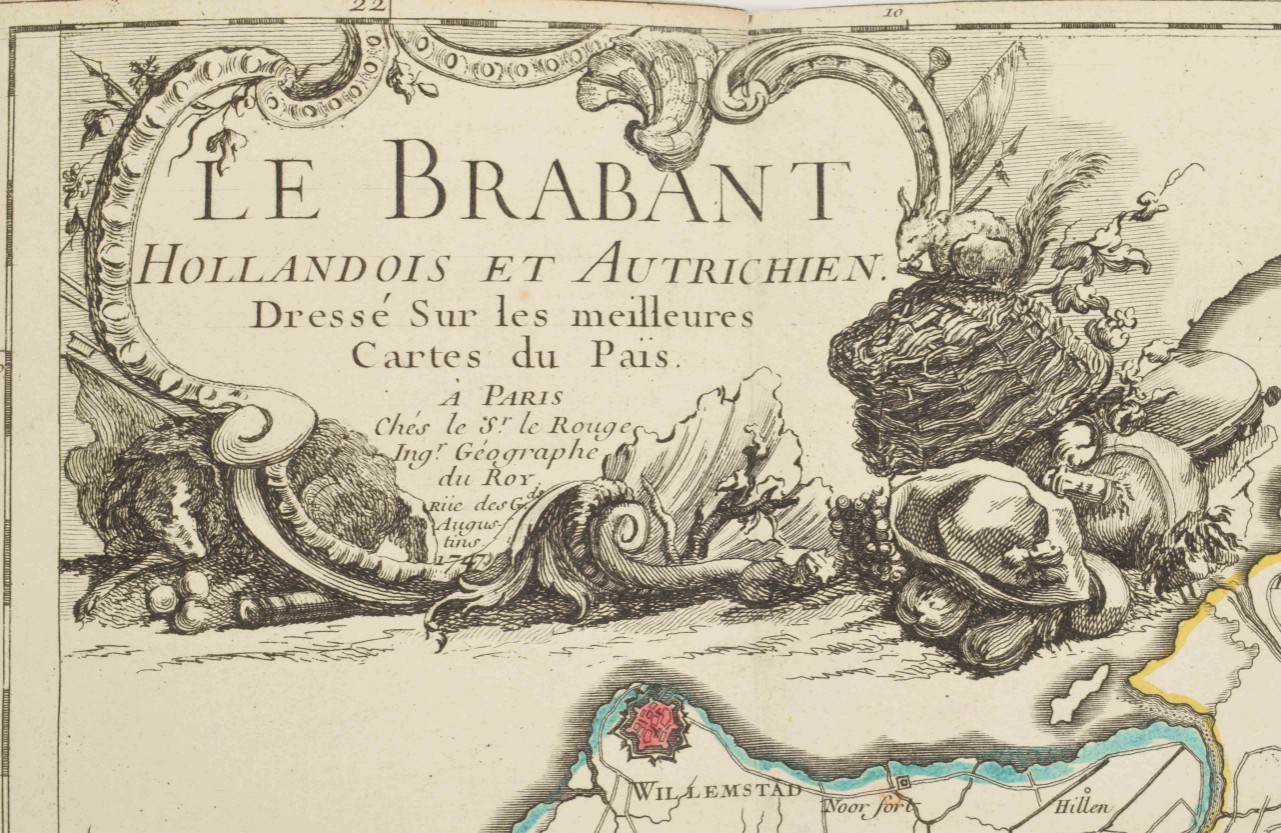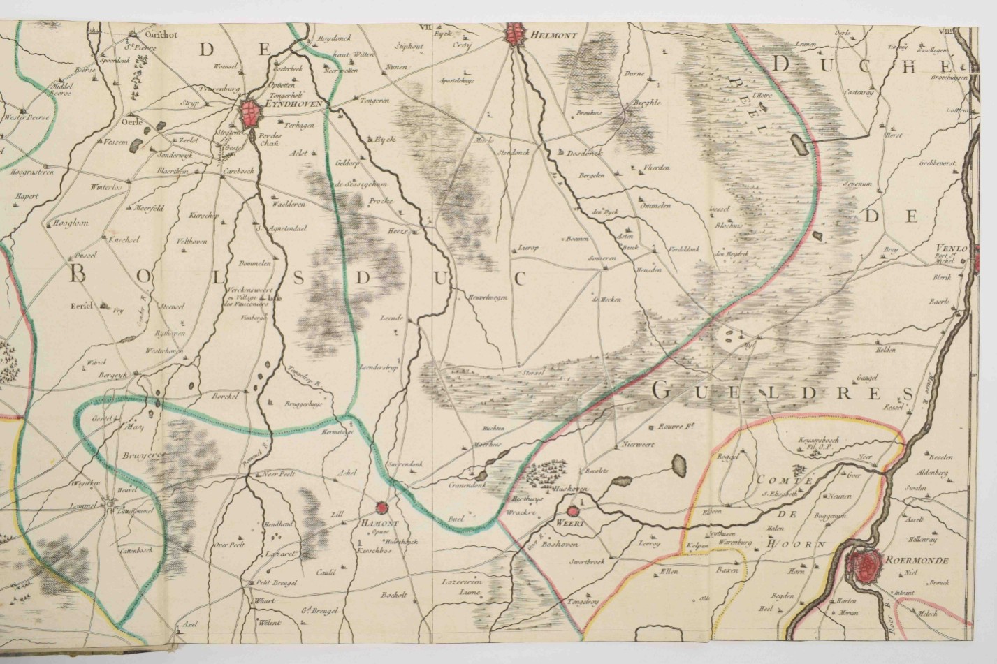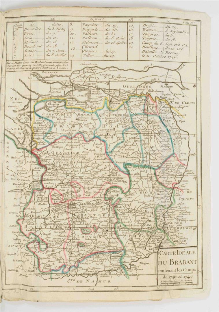 Cased wrapper, marbled in camouflage colours, 30 x 17 cm, with a general map with coloured outlines: Carte idéale du Brabant contenant les camps de 1746 et 1747 with legend and 8 folding maps (each 30 x 48 cm) with title: Le Brabant Hollandois et Autrichien. Dressé sur les meilleures cartes du païs. Paris, Le Rouge, 1747. All folding maps with coloured outlines and cities fully coloured in red. Curious. Rare.