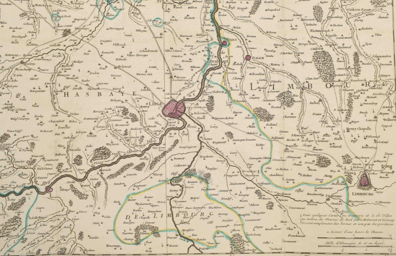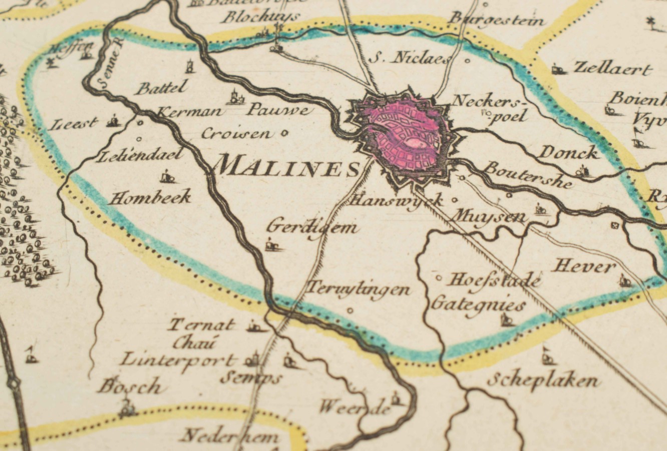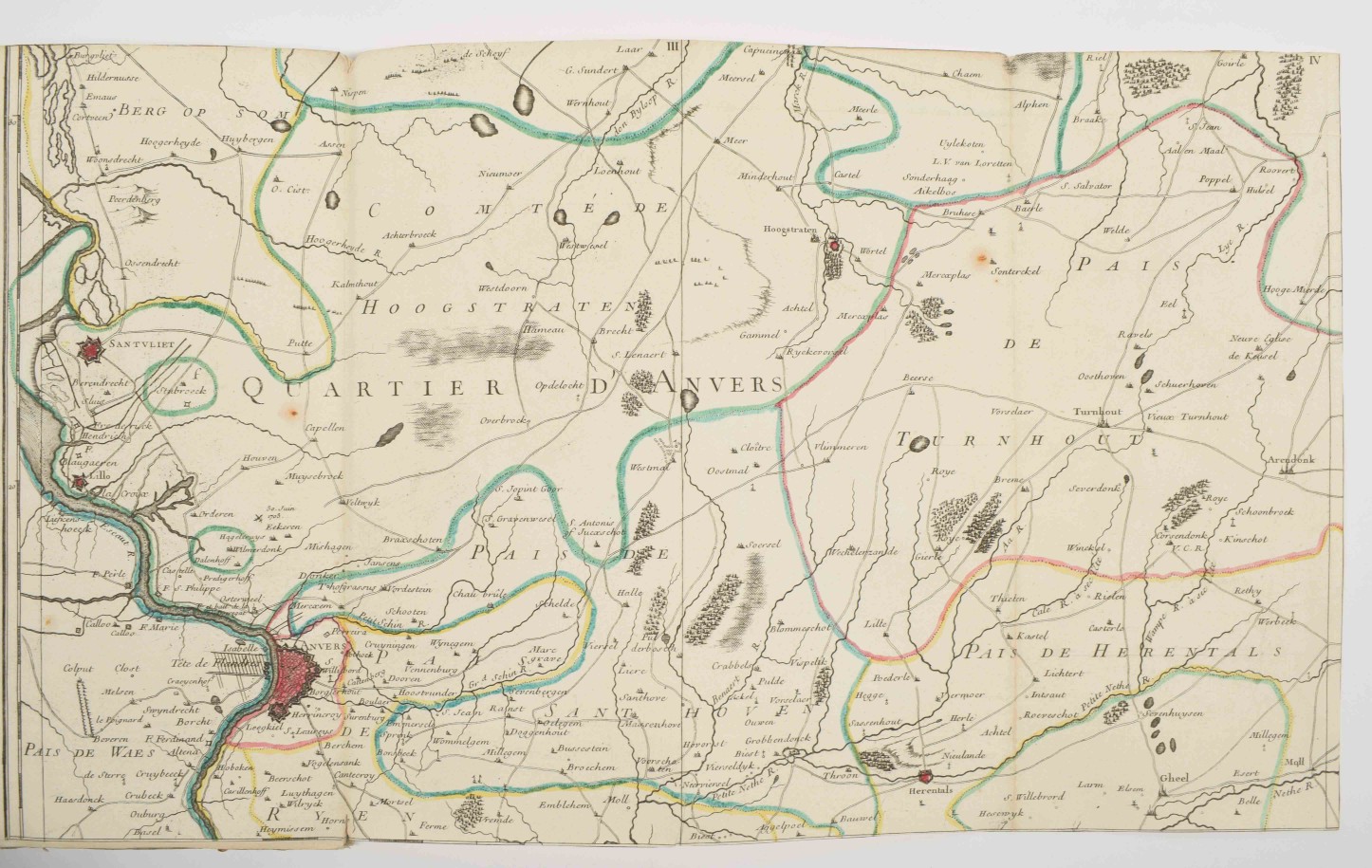 Cased wrapper, marbled in camouflage colours, 30 x 17 cm, with a general map with coloured outlines: Carte idéale du Brabant contenant les camps de 1746 et 1747 with legend and 8 folding maps (each 30 x 48 cm) with title: Le Brabant Hollandois et Autrichien. Dressé sur les meilleures cartes du païs. Paris, Le Rouge, 1747. All folding maps with coloured outlines and cities fully coloured in red. Curious. Rare.