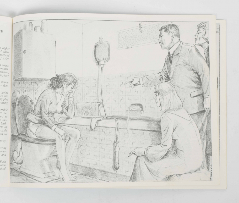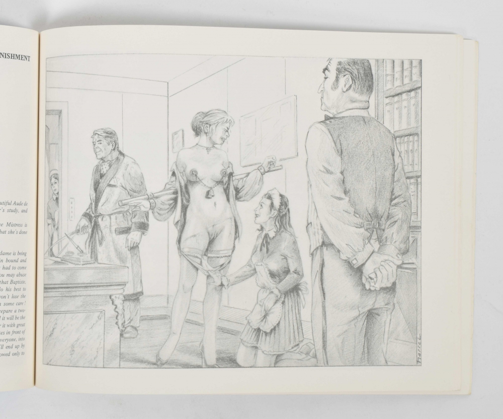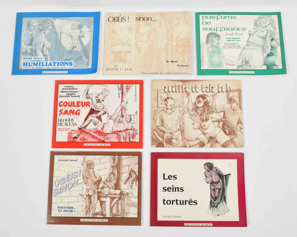 Les seins torturés. Collection Secrèt, Delta Plus, 1988. Oblong, sc + from the same series: Souffre et tais toi!; Couleur Sang/ Bloody Heavens; Obéis! Sinon...souffrir...et jouir!; Parfums de souffrance/ painful flavours; Humiliations; Obéis! sinon...souffrir et jouir. Petite encyclopédie des pratiques Sado-Masochistes. The latter with light traces of use, others in good condition.