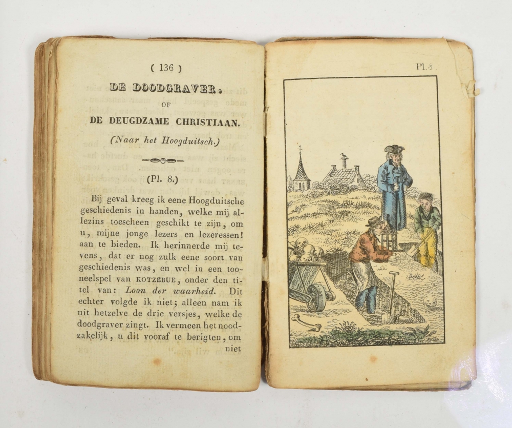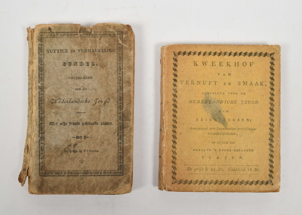 aangelegd voor de Nederlandsche jeugd van beide seksen; doormengd met kunstmatige gezelschaps-vermakelijkheden, en versierd met fraai in 't koper gebragte platen. Amsterdam, H. Gartman, 1819. 8vo. 88 p. with 6 plates + Nuttige en vermakelijke bundel, opgedragen aan de Nederlandsche Jeugd. Met acht fraaije gekleurde platen. Sneek, Holtkamp, c. 1800. 144 p. with 8 plates. Binding stained, spine broken, contents good.