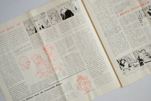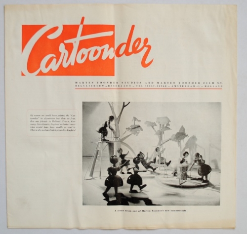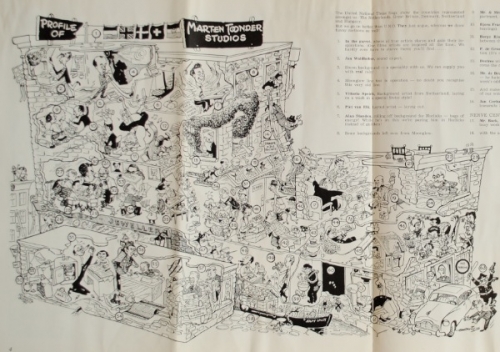 See the Dutch description: Zeer zeldzaam blad ter promotionele ondersteuning van de Marten Toonder studio's en film. Engelstalig blad waarin aandacht voor diverse creaties van Toonder, en een fraaie karikatuur van de studio en haar werknemers op de middenpagina.