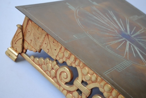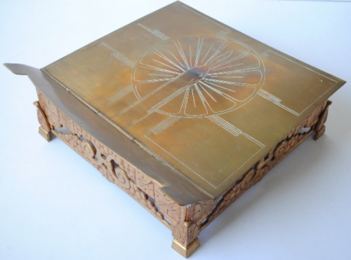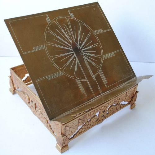 This item contains no English description. See the Dutch description: Koperen lessenaar met Jugendstilmotief. 35 x 35 cm. Ca. 1920.