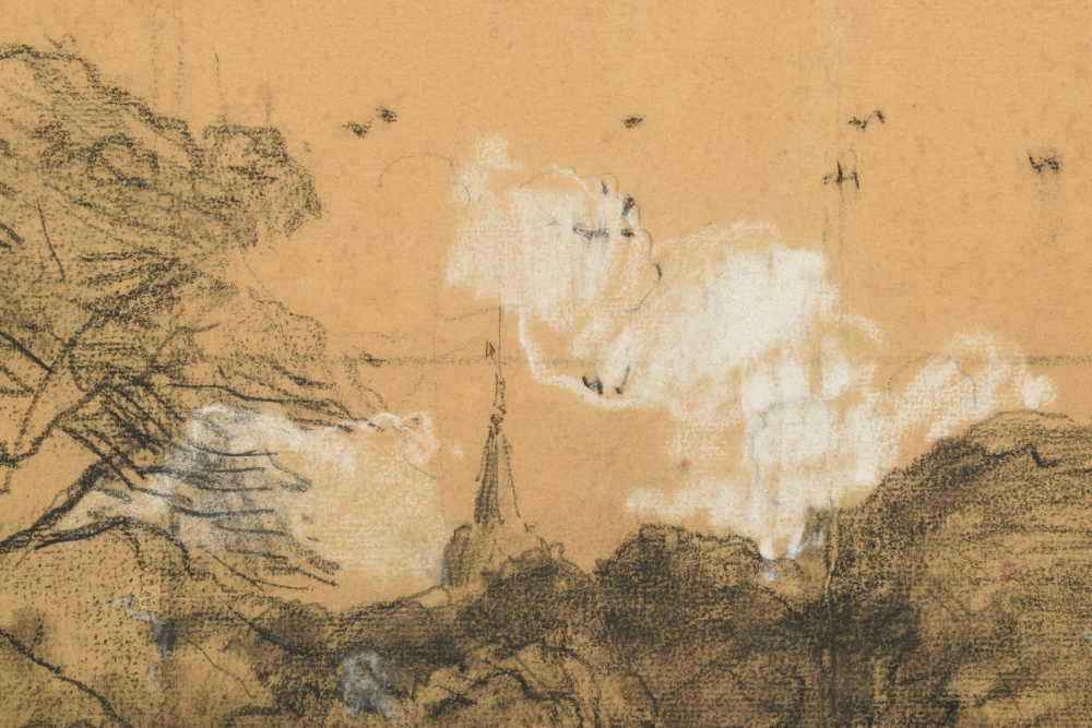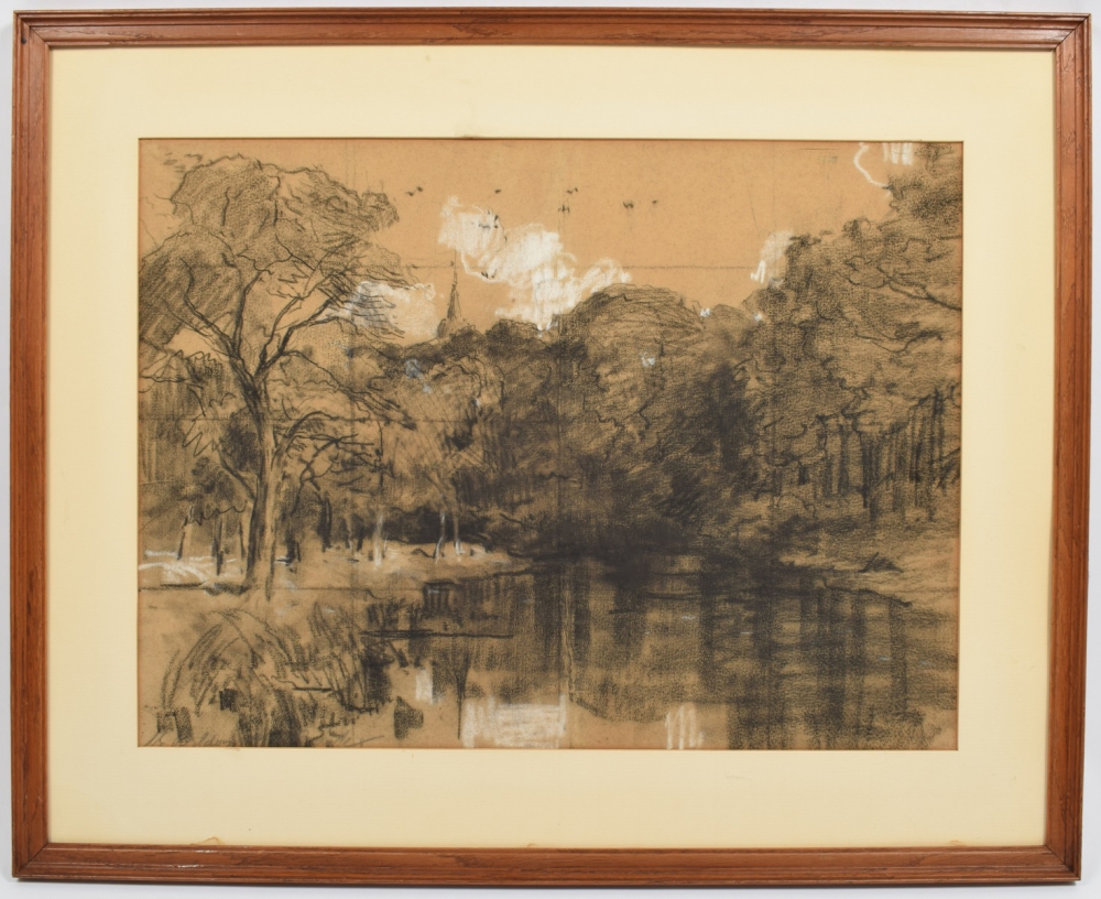 Vondelpark pond, Amsterdam. Charcoal drawing. Signed b.l. Framed in mount (no glass). 59.5 x 44 cm.