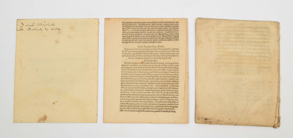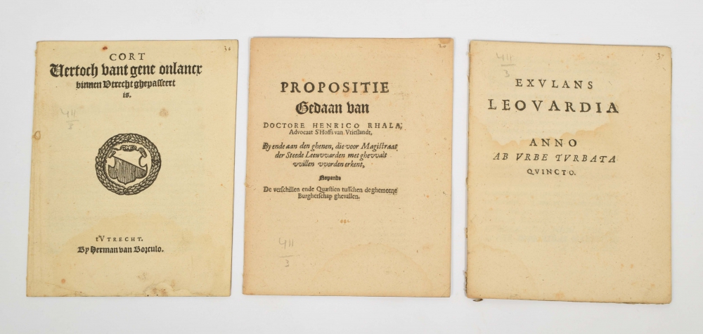 Combined with: Propositie Gedaen van Doctore Henrico Rhala; Advocaat S'Hoffs van Vrieslandt (...) Nopende de verschillen ende Quaestien tusschen de ghemeene Burgherschap ghevallen. No place or publisher, [1614]. Small 4to, title page, 6 pp., one ills. capital, minor dam. to top p. 3/4 outside the text. See Van Alphen 76. And: Exulans Leovardia. Anno Ab Urbe Turbata Quincto. Henricus Johannes Rhala. No place or publisher, [1615]. Small 4to, title page, 27 pp., Latin text. No wrapper, quires tender, various water stains. The last two pamphlets on the unrest in Leeuwarden in 1610; partly administrative, partly religious. (total 3)