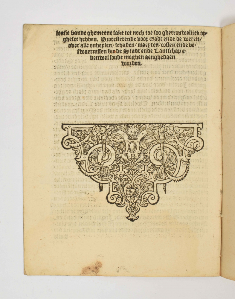 Cort Vertoch vant gene onlancx binnen Vtrecht ghepasseert is. Utrecht, Herman van Borculo, [1610]. Small 4to, 6 pp., title with arms of Utrecht in woodcut, large woodcut on last leaf, no wrapper, title page, mild tanning and minor dam., last blank page with ms. in ink. Concerns the conflict about administrative (and religious) power in the city of Utrecht.
