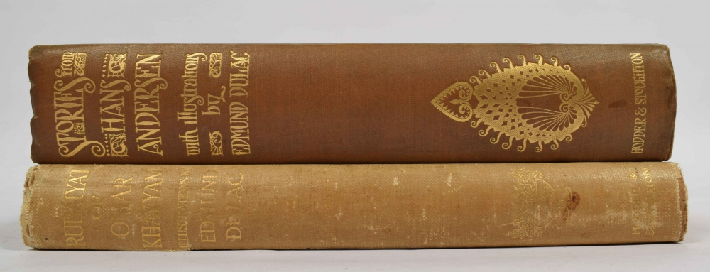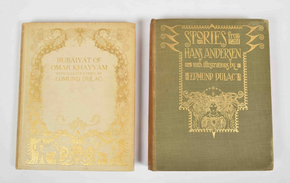 Rendered into English Verse by Edward Fitzgerald. Printed from the second edition. London, Hodder and Stoughton, c. 1910, with 20 tipped-in plates by Dulac, in gilt and decorated buckram, 4to. Buckram partly split at spine ends and along rear joint, binding sl. stained, occ. trifle foxed, else good copy + Dulac (ills.), Stories from Hans Andersen. London, Hodder & Stoughton, 1911, viii,250 pp., with 28 tipped-in plates by Dulac, in gilt and decorated cloth, 4to. Some wear to extremities, corners bumped, endpapers tanned, else good and clean copy.