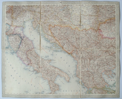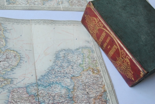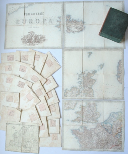 See the Dutch description: Josef Scheda, Wien, vermehrte und verbesserte Auflage 1859. Opvouwbare kaart van Europa in 25 delen. Compleet incl. overzichtkaartje in origineel halfled. foudraal.