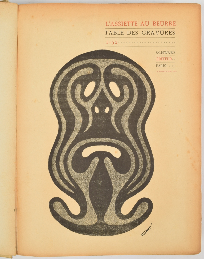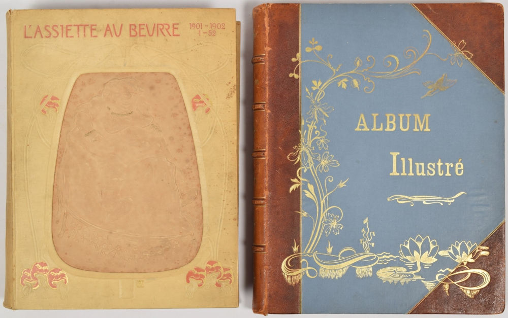 No. 1-52. Paris, Schwarz, 1901-1902. Complete first year in 52 issues bound in the orig. deluxe jugendstil publisher's binding, beige cloth with orange decoration, front board with inlaid relief, title in orange on spine. Incl. Table des Gravures en numéro spécial (hors série) Les Falsificateurs de Lait. With illustrations by Van Dongen, Iribe, Jossot, Kupka, Steinlen and others. First pp. loose, binding sl. stained and sl. torn in on spine ends, several pp. sl. frayed along outer margin, else good + Ferdinand Bac, 7 albums in one volume: Modèles d'Artistes; Femmes de Theatre; Les Alcôves; Les Fêtes Galantes; Les Amourettes; La Femme Intime; Nos Femmes. Paris, H. Simonis Empis, c. 1900. Bound with orig. wrappers in contemporary gilt halfleather. Leather worn on spine and along edges, else good.