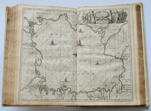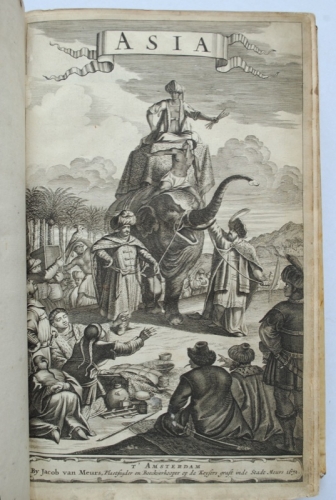 See the Dutch description: Behelsende de landschappen van Kandahar, Kabul, Multan, Haïkan, Bukkar, Send of Diu, Jesselmeer, Attak, Peniab, Kaximir, Jangapore, Dely, Mando, Malva, Chitor, Utrad, Zuratte of Kambaye, Chandisch, Narvar, Gwaliar, Indostan, Sanbat, Bakar, Nagrakat, Dekan en Vissiapour. Beneffens een volkome beschryving van geheel Persie, Georgie, Mengrelie en andere gebuur-gewesten. Vertoont in de benamingen, grens-palen, steden, gewassen, dieren, zeden der inwoonders, drachten, bestiering en gods-dienst. Olfert Dapper, J. van Meurs, Amsterdam, 1672. 379,(3), 184,43,(5) p., gegraveerde frontispiece, 28 platen/ gezichten (4x dubbel), 3 kaarten, ills., blind gestempeld perkament uit de tijd met moderne letterpiece, folio.
