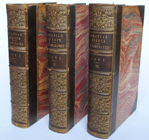 See the Dutch description: Commonly Called in England, The Arabian Nights Entertainments. E.W. Lane (vert.), C. Knight and Co., London, 1841. 3 delen, vele houtgravures, gebonden in halfmarokijn met rijkelijk vergulde rug, goud op snee.