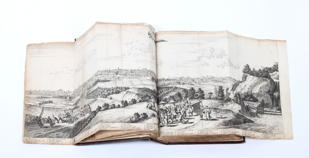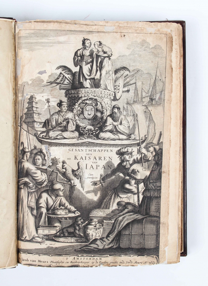 vervaetende wonderlijke voorvallen op de Togt der Nederlandsche Gesanten: Beschryving van de Dorpen, Sterkten, Steden, Landschappen, Tempels, Gods-diensten, Dragten, Gebouwen, Dieren, Gewasschen, Bergen, Fonteinen, vereeuwde en nieuwe Oorlogs-daeden der Japanders. Arnoldus Montanus, Amsterdam, 1669, (6), 456,(15) p. Large engraved map, 21 (of 24) (folded) views/plates, many illustrations in the text, modern leather binding in old style, folio.