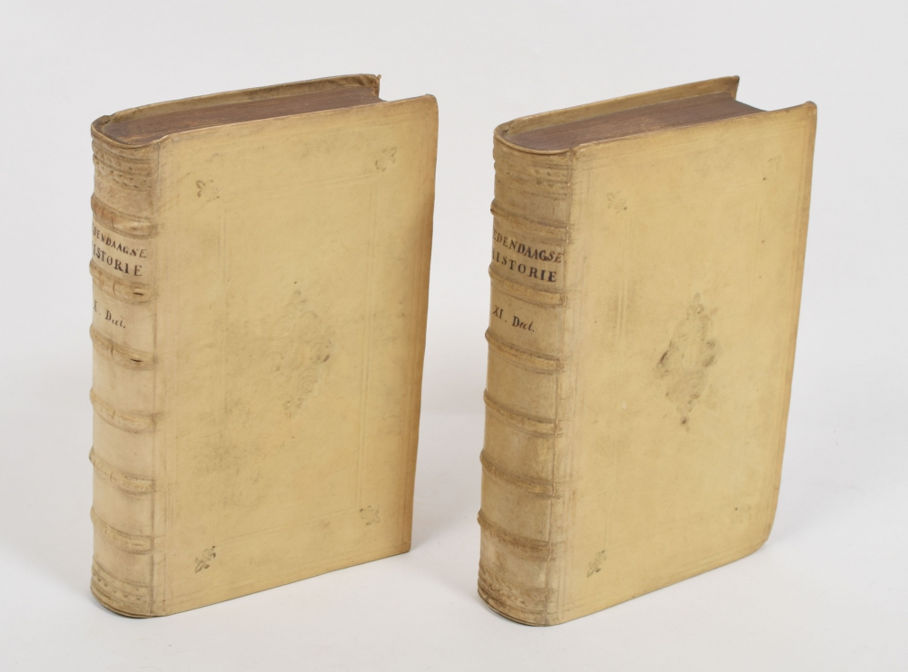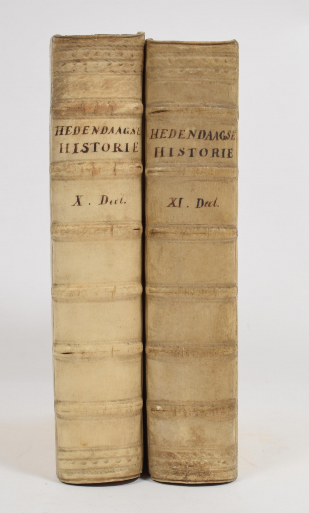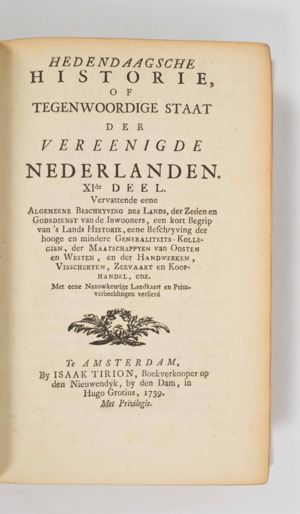 (1) Xde deel. Behelzende eene beschryving van den Tegenwoordigen Staat der Oostenryksche, Fransche en Pruissische Nederlanden. Isaak Tirion, Amsterdam, 1738. First printing. Vellum, blindstamped, illustrated frontispiece by J.C. Phillips with a historical map of the Netherlands with the arms of the Southern and Middle Dutch provinces, title page with small vignette and 4 part titles, (12),562 pp. + bladwyzer, 4 maps, 1 portrait, 3 prints and 7 plans, all in copper engraving of which most folding. (2) XIde deel. Vervattende eene algemeene beschryving des lands, der zeden en godsdienst van de inwooners, een kort begrip van 's lands historie (...). Isaak Tirion, Amsterdam, 1739. First printing. Vellum, blindstamped, allegorical frontispiece by J.C. Phillips, title page with small vignette and 5 part titles, (2),(24),638,(20) pp. + bladwyzer, 1 map, 6 prints and 5 portraits.