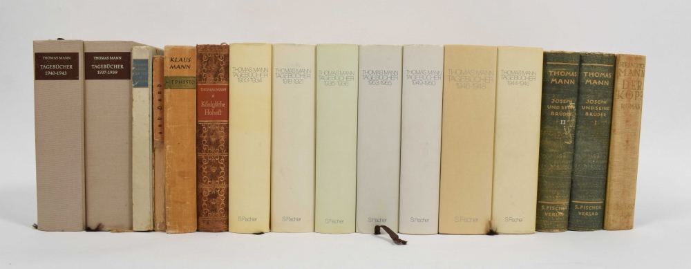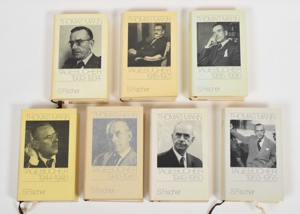 Tagebücher 1918-1955. 9 (of 10) vols.; lacks vol. 8, 1949-50. Frankfurt am Main, S. Fischer, 1977-1995. 1st ed. (vol. 10 in 2nd ed.). Bound with dust jacket, 8vo. Dust jacket vol. 1 torn, spine vol. 6 discoloured and missing with vols. 4 and 5, else good + Der Tod in Venedig. Novelle. Berlin, S. Fischer, 1913, 8th ed. 145,(4) pp., half faux-vellum, small 8vo. Sl. foxed, corner cut from endpaper + Joseph und seine Brüder. S. Fischer, 1952, 2 vols., uniformly bound with dust jacket, 8vo - and 5 more.